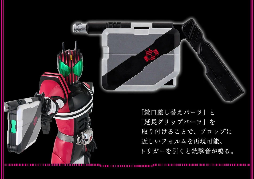 Use this product in three mode: Book Mode, Sword Mode, and Gun Mode. Book Mode can be attached to the separately sold “CSM Decadriver ver.2” with the main body folded, and 4 Rider Cards can be set on the active holder side and 6 Rider Cards can be set on the storage holder side. With the sound effect button newly installed on the main unit, it is possible to play unique sounds such as “card withdrawal sound”, “card flipping sound”, and “change sound from blank card”.