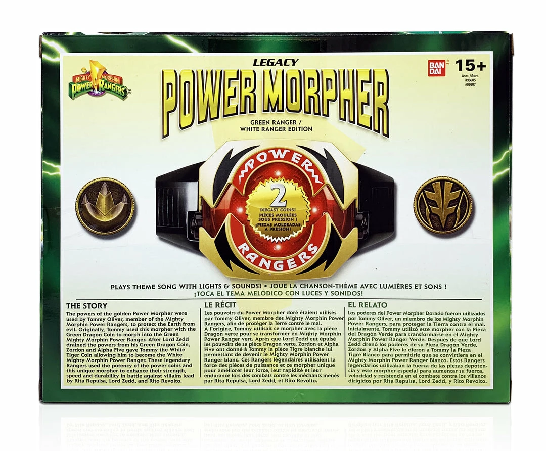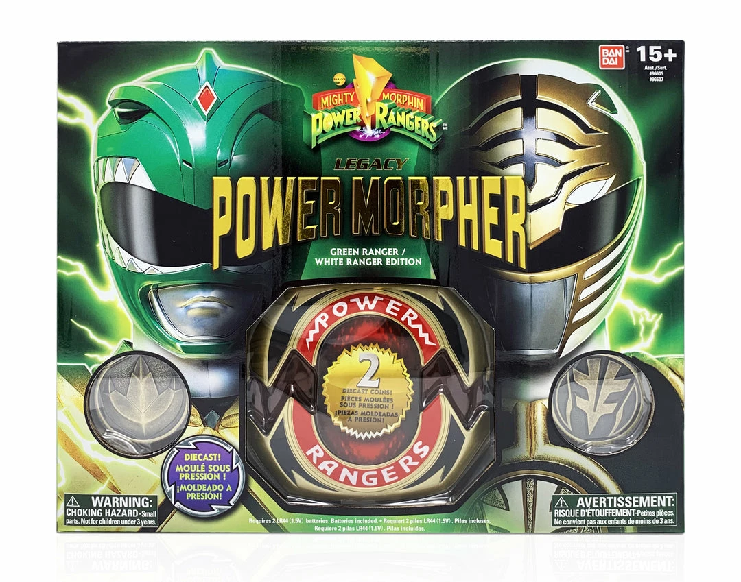 True fans of the Power Rangers will instantly recognize this iconic must-have Morpher, the Legacy Power Morpher in a Green Ranger / White Ranger Edition! Featuring all of the detail from the original Mighty Morphin series, this Morpher features a die-cast metal housing, includes two die-cast metal power coins, show accurate lights, and sound effects, including the original Mighty Morphin theme song.