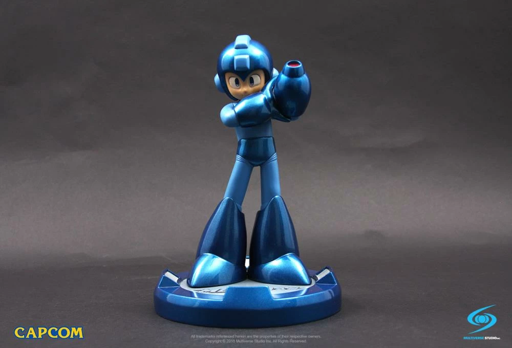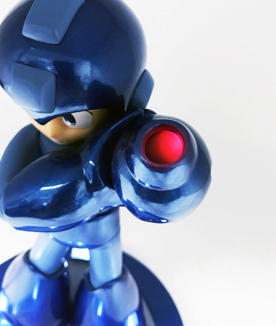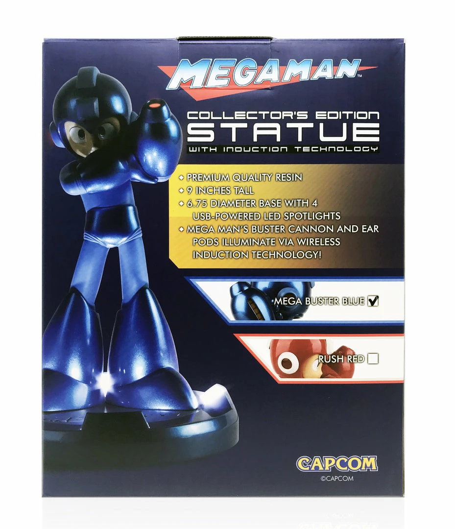 The Blue Bomber is faithfully recreated in this fantastic 10-inch statue featuring a chrome resin finish, a 6-inch diameter base features an inscription of the Mega Man logo with LED spotlights, plus his Buster and helmet lights up via induction technology when you stand the figure on the base.