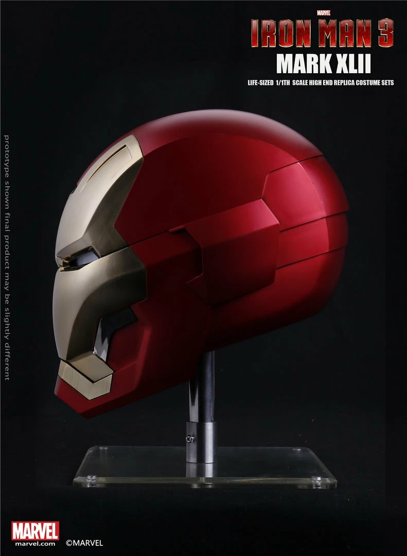 Limited Edition Iron Man Mark XLVI (Mark 46) Life-Size 1:1 Scale Helmet that comes equipped with an electronic open and close feature! This added feature brings a certain ‘life’ to this display piece that traditional 1:1 scale helmets or other props may not have in many cases. This helmet is based on the Iron Man Mark 46 (XLVI) armor design as seen in the popular film Captain America: Civil War. This particular Iron Man armor had a lot of on-screen presence in the film and is one of the more beloved and iconic armors for Iron Man collectors the world over.