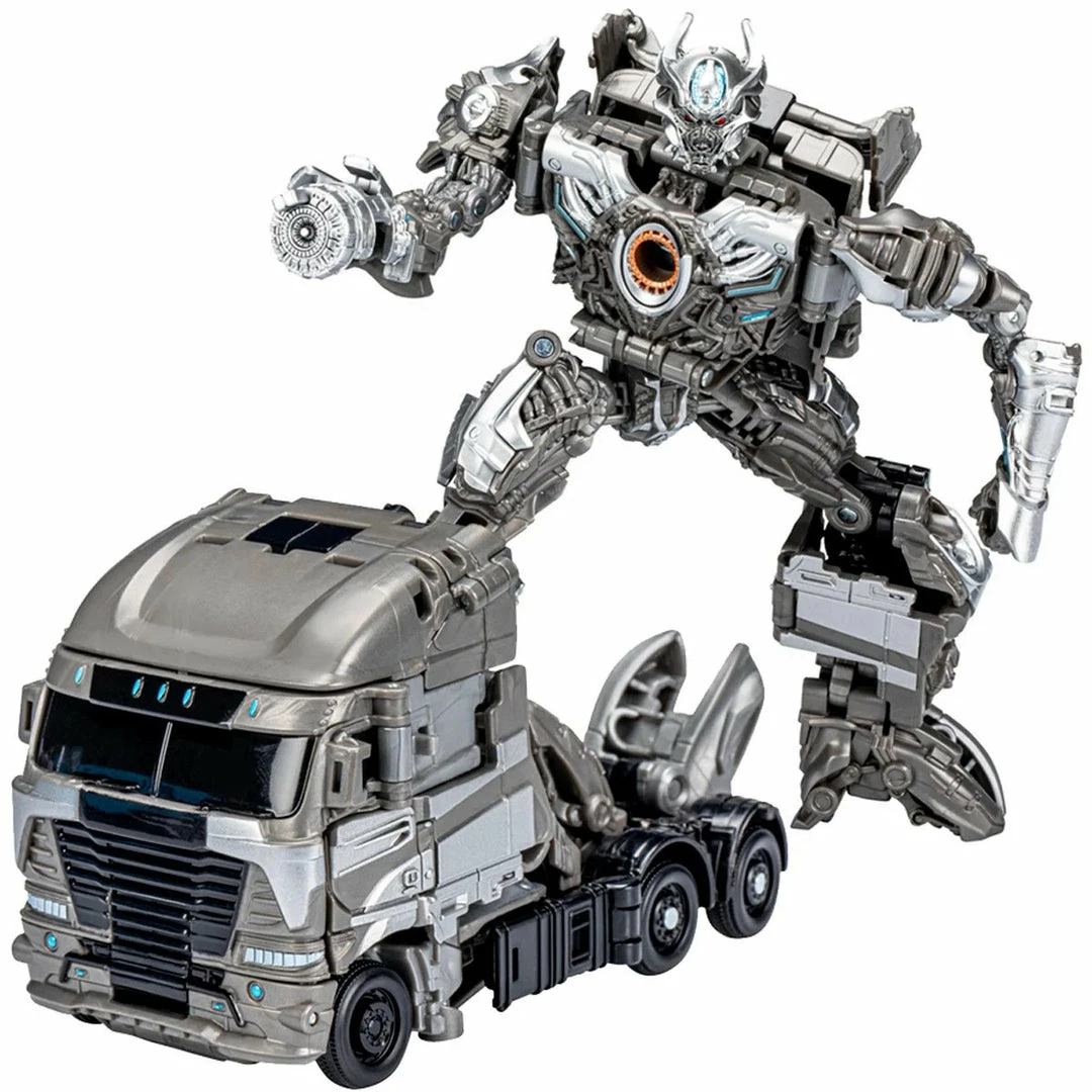 This Studio Series 90 Voyager Class Transformers: Age of Extinction-inspired Galvatron figure converts from robot to Argosy truck mode in 30 steps. Remove backdrop to showcase Galvatron in the Hong Kong Pursuit scene. In the Hong Kong Pursuit scene from Transformers: Age of Extinction, Galvatron leads the KSI Decepticons into Hong Kong to gain control of the seed. Pose the figure out with the included arm-mounted cannon accessory and imagine re-creating this classic movie moment!