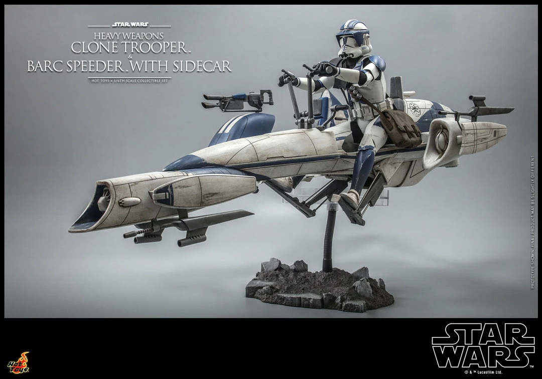 The brand new sixth scale BARC Speeder measures at 68cm in length and comes with an attachable sidecar armed with an articulated blaster. The vehicle has a detailed mechanical structure, astonishing paint application with weathering effects, articulated handlebars, and a rocky themed base for a variety of poses. Â