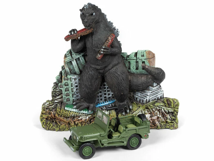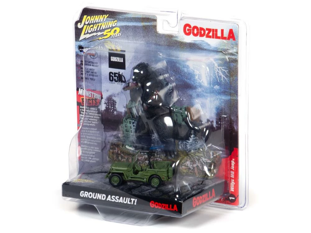 The Johnny Lightning Godzilla Ground Assault features the King of Monsters on a destroyed city base chomping on some trains. The included Willys MB Jeep features a die-cast body and rubber tires.