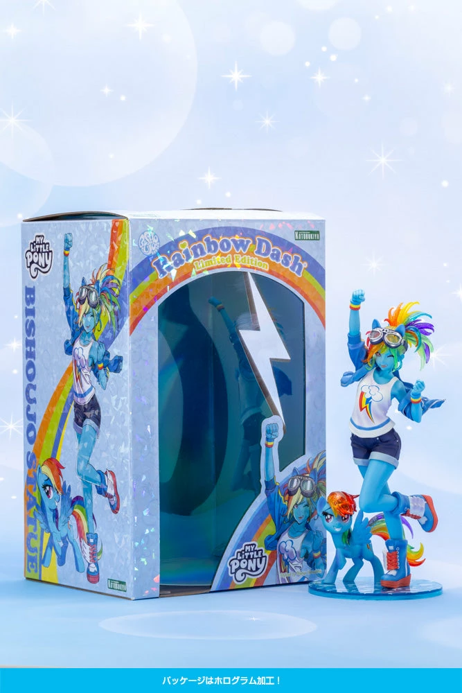 The skin tone now matches her appearance in “My Little Pony: Equestria Girls”. The packaging for this figure has also been upgraded with a hologram design to add a completely different finish from the regular Rainbow Dash Bishoujo for fans to enjoy.