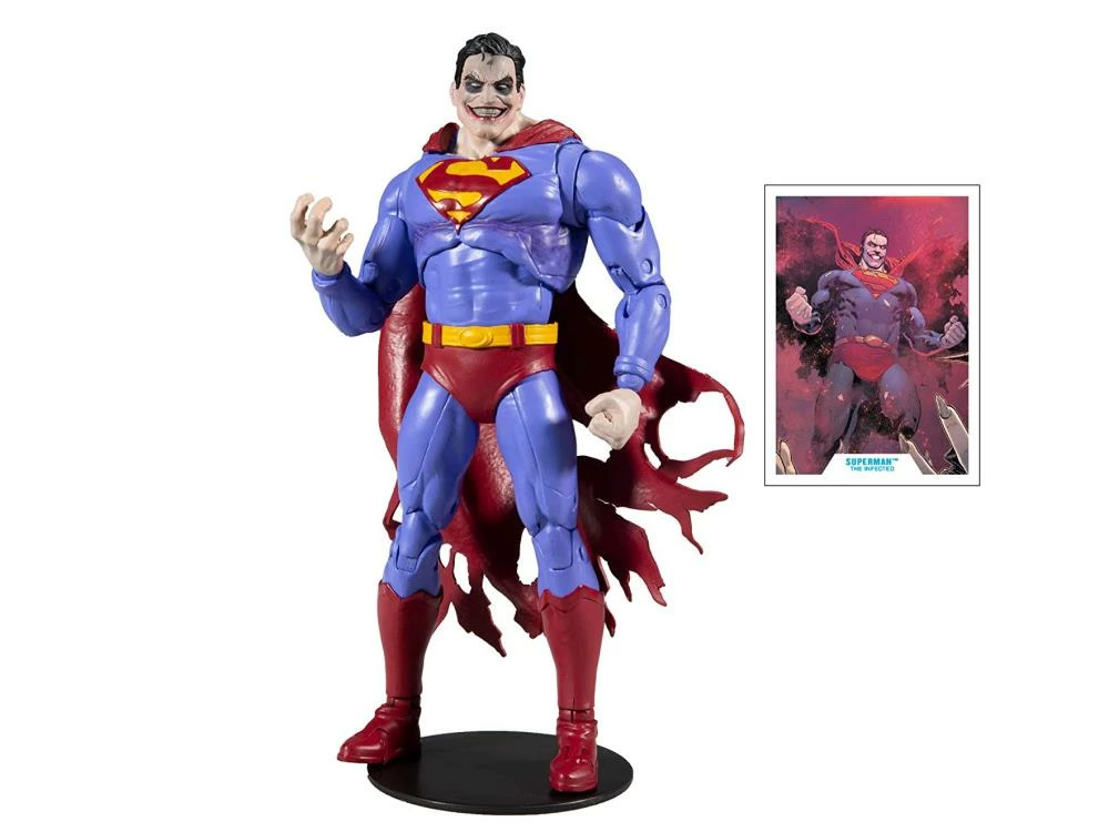 This Superman (The Infected) figure is based on The Infected storyline in the comic book series Batman/Superman (2019). Superman (The Infected) comes with an alternate pair of hands, and a base. The figure also includes 1 of 4 pieces that, when combined with the remaining pieces, will assemble the Batman of Earth-12, aka The Merciless. It also includes a collectable art card with comic book artwork from Batman/Superman #2 (2019) on the front, and a character biography on the back.