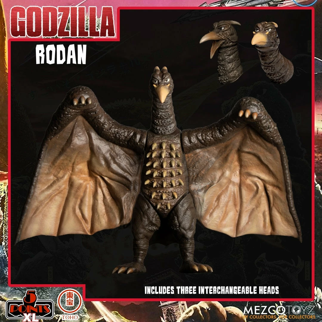 - Rodan – Irradiated Pteranodon and flying menace! Rodan comes with an alternate closed-mouth head portrait.