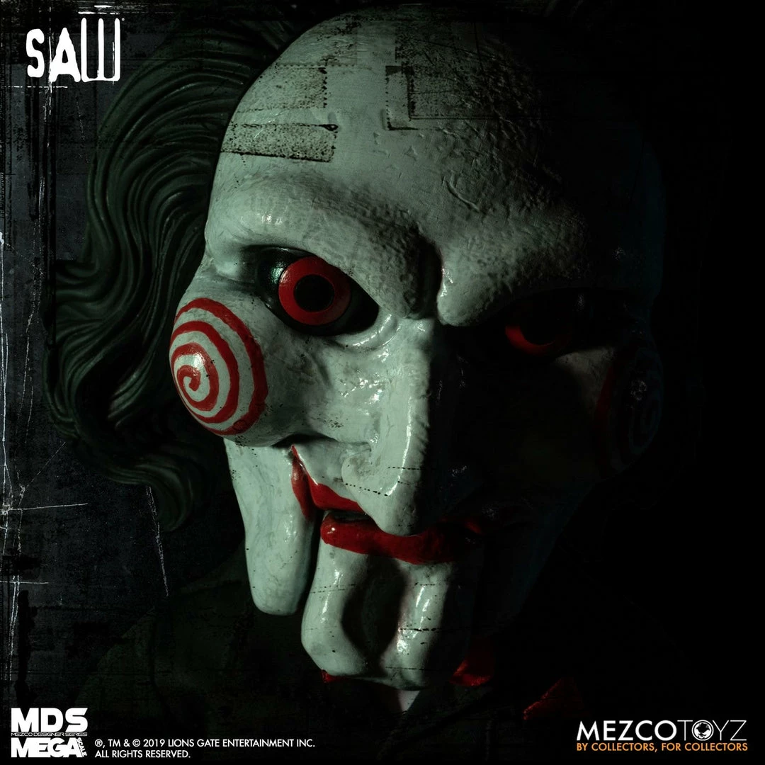 From the Saw series, the Designer Series Mega Scale Billy stands 15 inches tall with 11 points of articulation and features talking effects. With his blackened eyes and red irises always watching, Billy is dressed in his infamous tuxedo and bowtie.