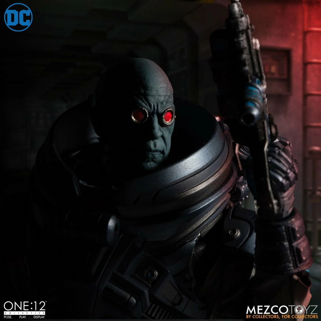 Mr. Freeze, dressed in his armored cryo-suit, emerges from his frigid laboratory to join the One:12 Collective figure lineup. Standing over 6 inches tall, Mr. Freeze is equipped with a light up freeze ray cannon and freeze ray pistol. Mr. Freeze is contained neatly in a cryo-chamber shaped tin, with a frosted window revealing the inside.