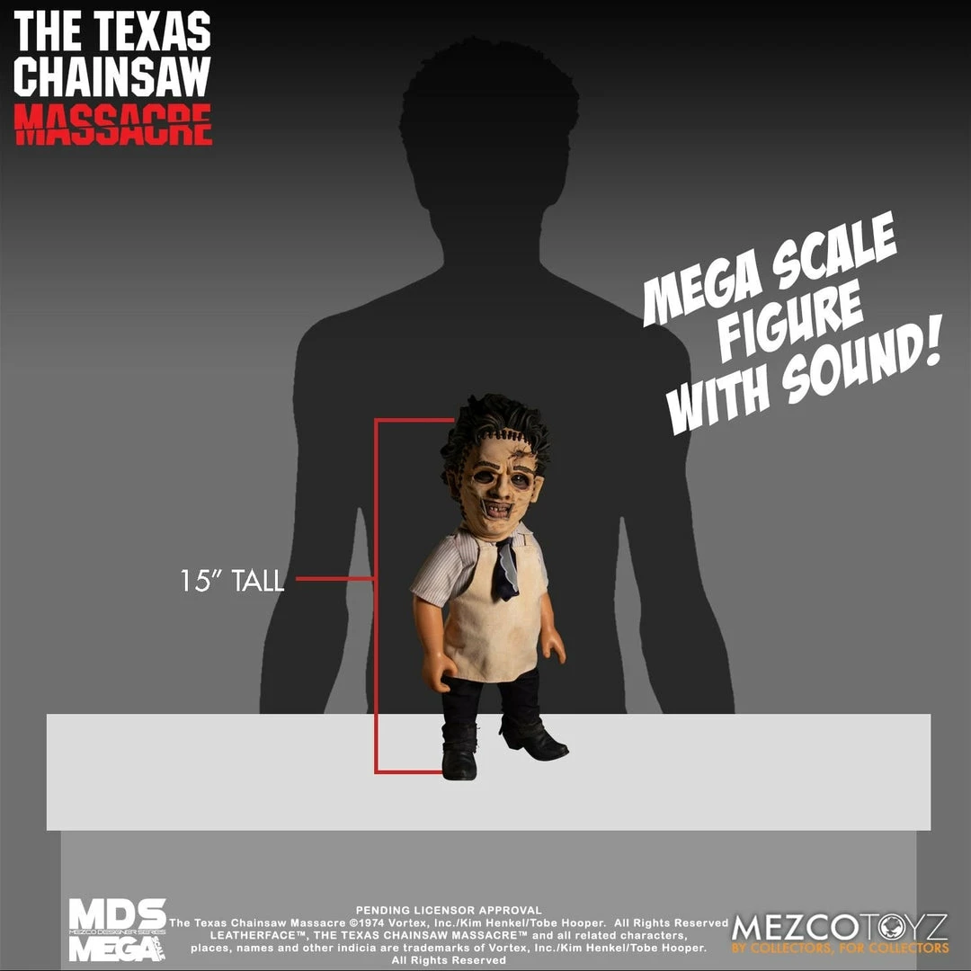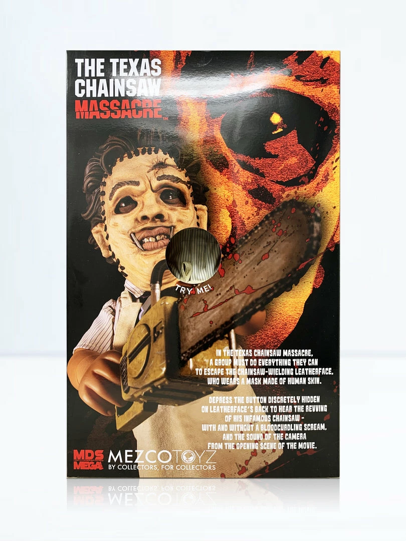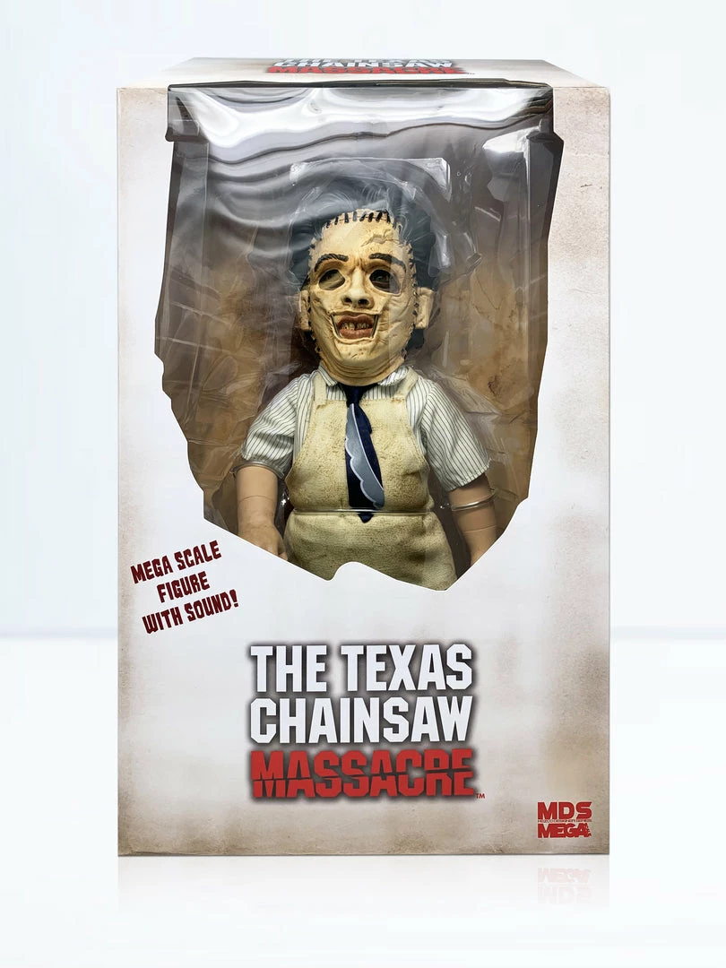 From the classic horror film, The Texas Chainsaw Massacre, Mezco present the Designer Series Mega Scale Leatherface. Standing about 15 inches tall, Leatherface wears a short-sleeve collared shirt and tie under his apron, slacks, and cowboy boots. He comes complete with a chainsaw accessory that he can hold neatly in his right hand.