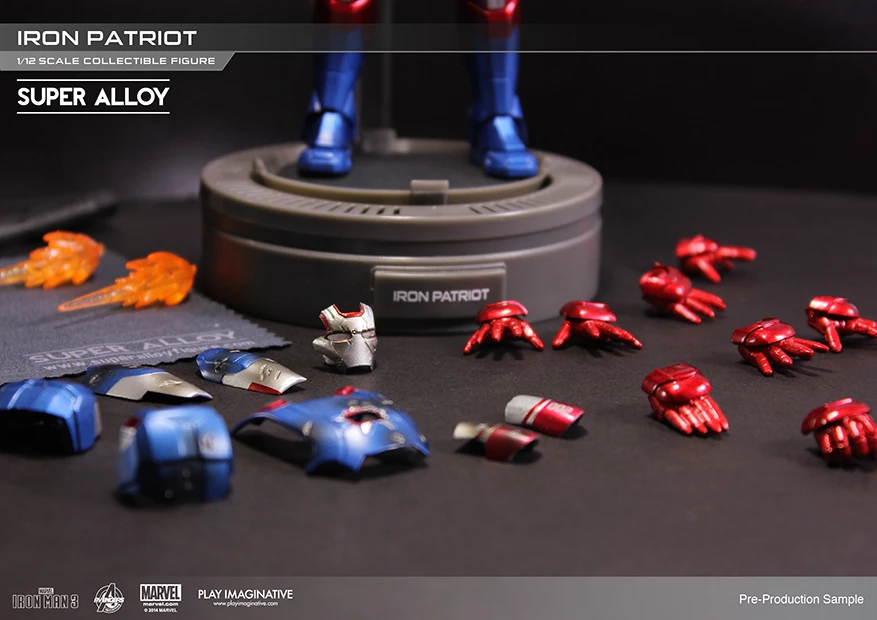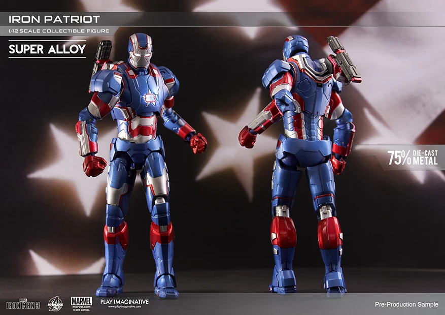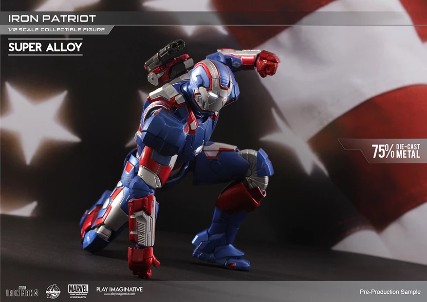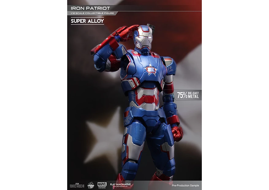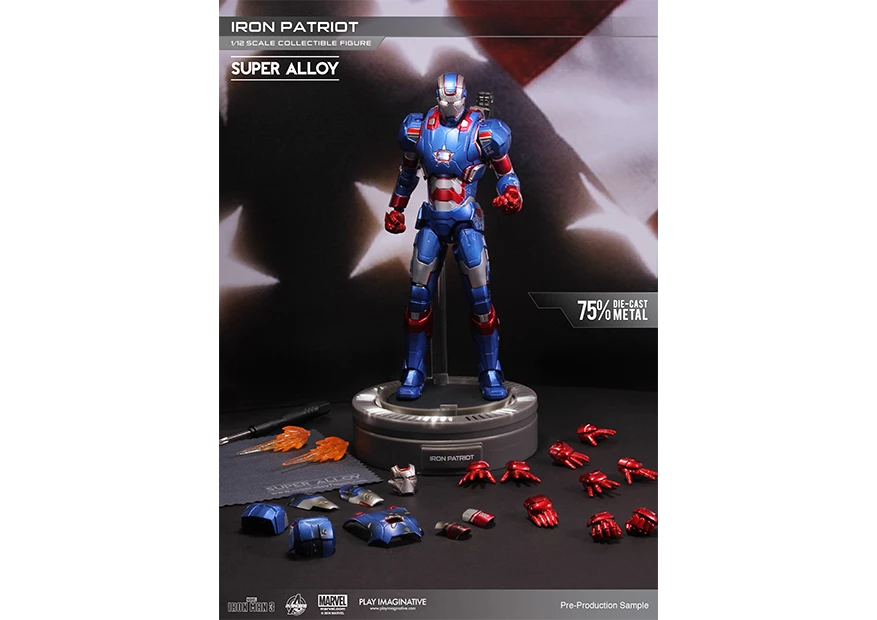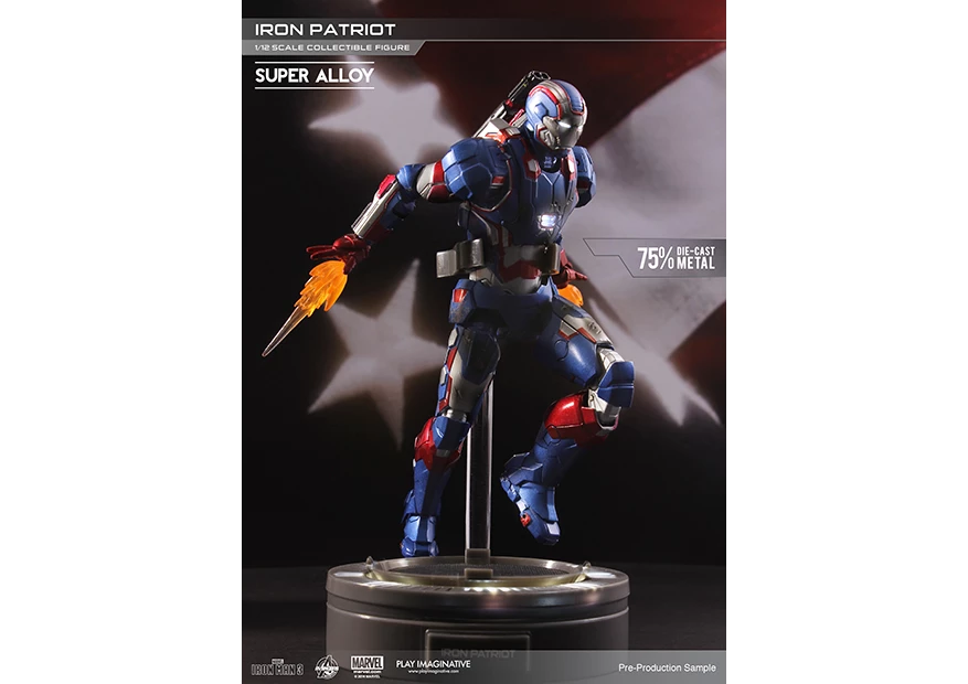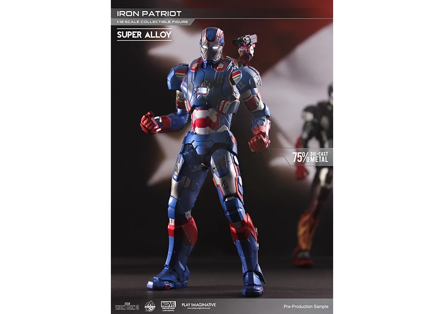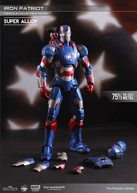 The Super Alloy 1/12 Scale Iron Patriot features 75% metal alloy in the classic black and silver colour scheme. This fully articulated model features interchangeable parts and accessories including a articulated cannon that swivels and rotates in different directions.