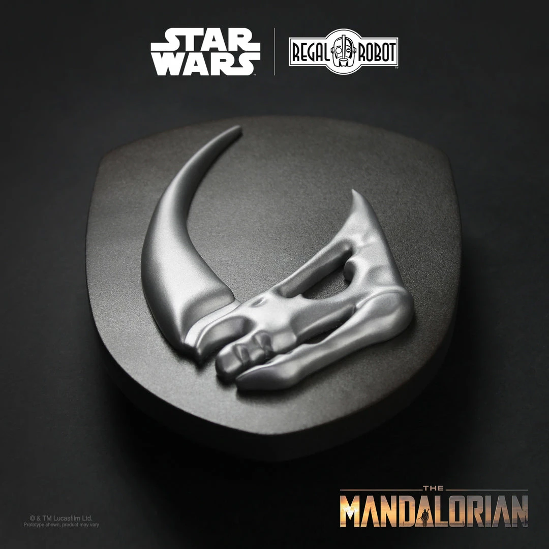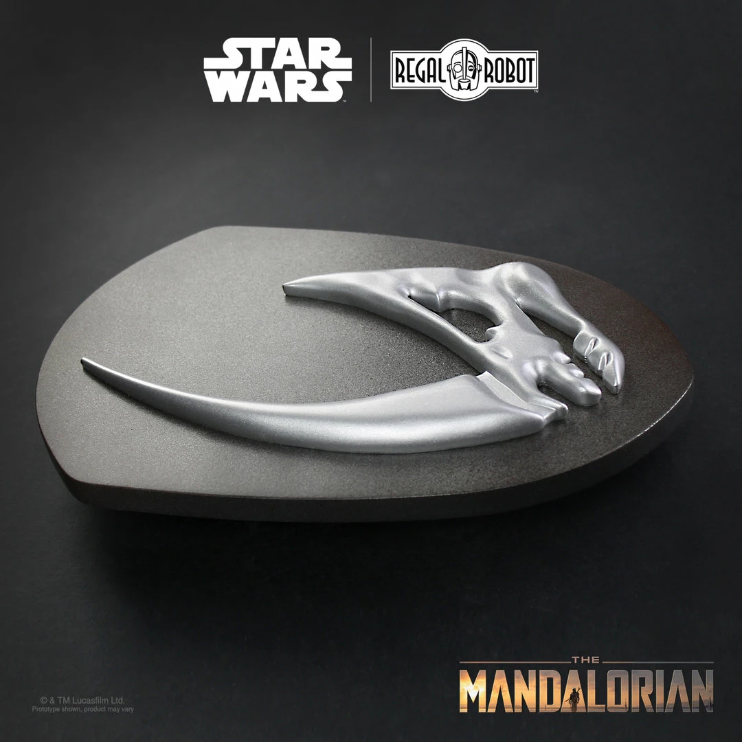 From the Disney+ series, The Mandalorian, Regal Robot presents the Mudhorn Signet Plaque, inspired by the season one finale. Measuring 11 inches, the faux metal mudhorn was digitally recreated with reference from Lucasfilm and is cast in resin. The signet comes mounted to a uniquely shaped wood plaque, painted in a distressed metallic mimicking the scorched beskar armor.