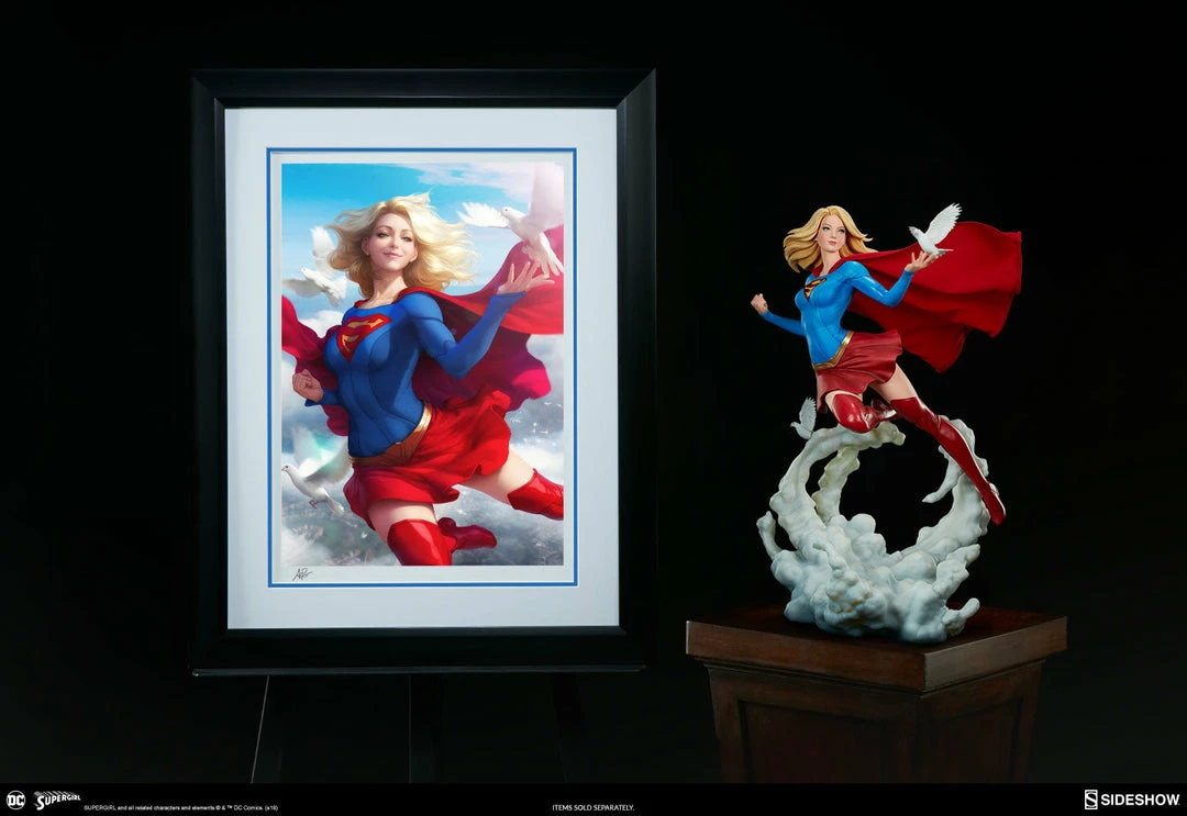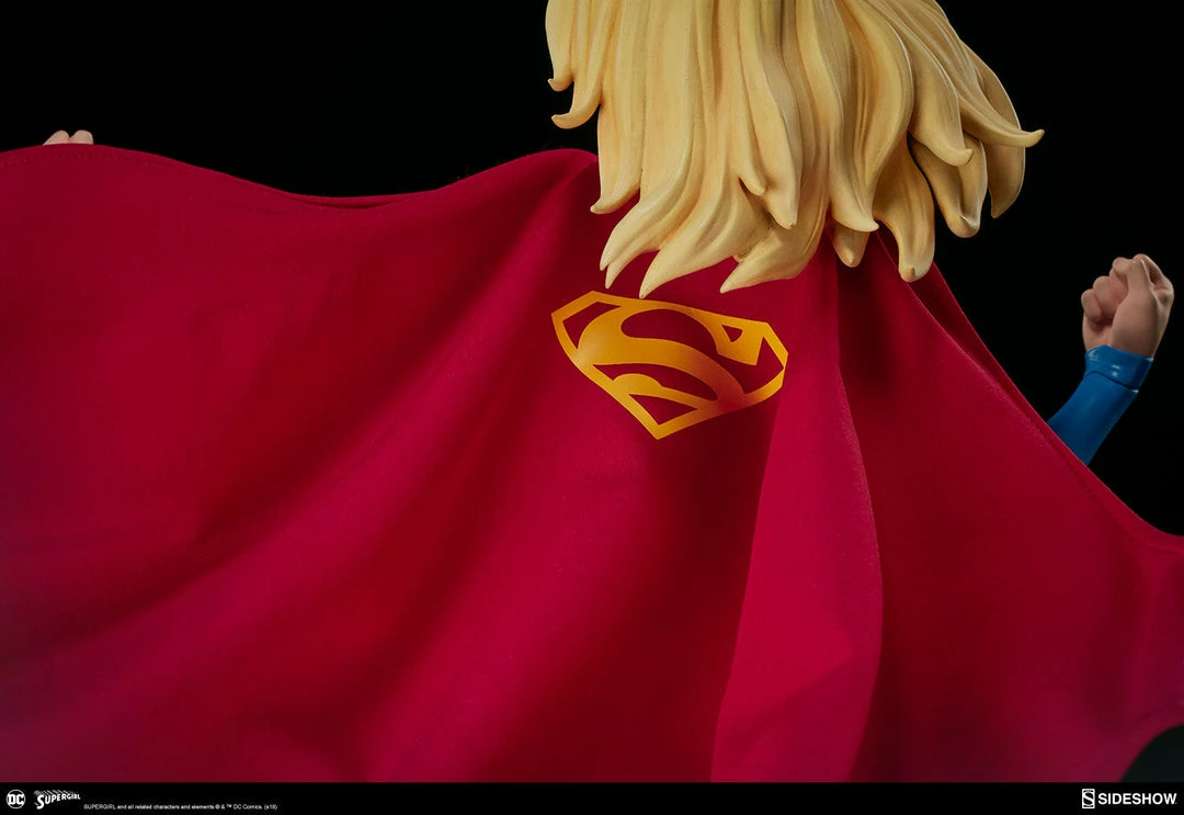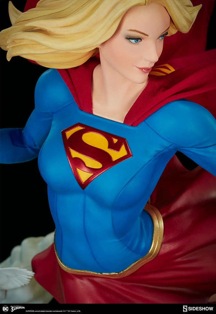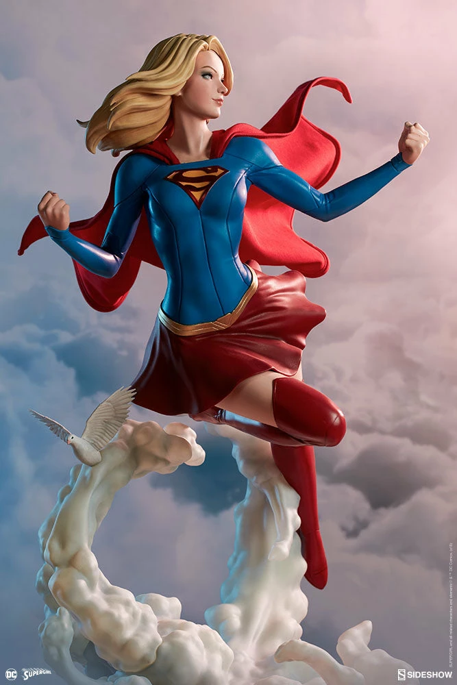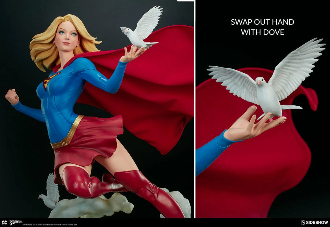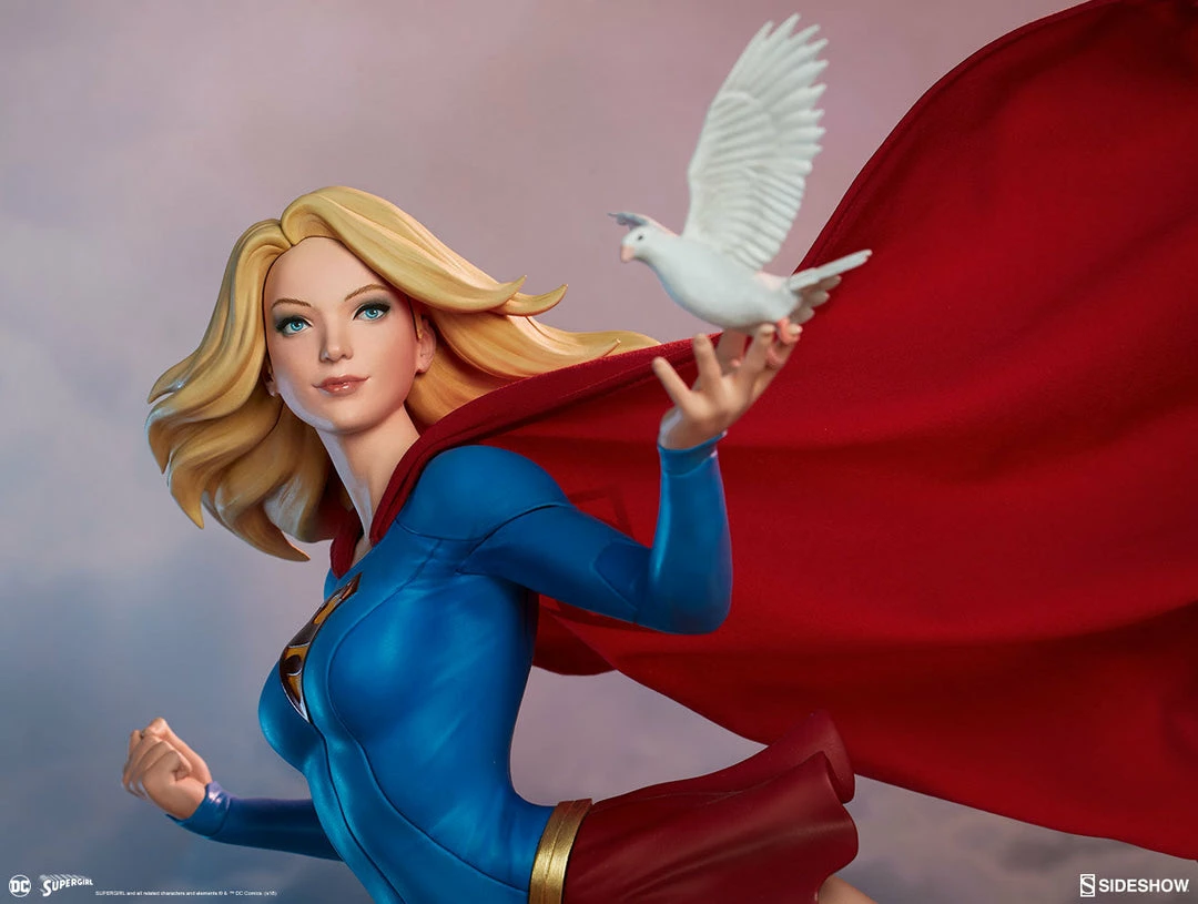 The polystone Supergirl Premium Format™ Figure has a sculpted blue costume with a dynamic red skirt and boots, with the iconic symbol of the House of El emblazoned on her chest. The figure also has a red fabric cape marked with her yellow symbol, with internal wiring to allow for custom cape posing options. Supergirl’s portrait has flowing blonde hair, and the figure includes an alternate left hand holding a white bird. Display Kara with a closed fist or with a feathered friend in both editions of this truly super figure.