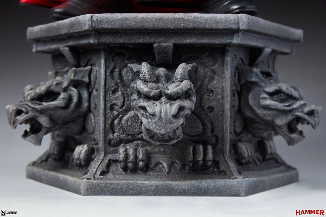 The Dracula Premium Format Figure measures 22.25” tall on top of a stone-like base with Gothic gargoyles as the dark and brooding count reveals his horrific visage to the innocents trapped in his castle. Sculpted with an incredibly detailed likeness of actor Christopher Lee as the iconic monster, this statue features the bloodshot eyes and shining fangs that forever changed pop culture’s image of the vampire. A meticulous paint application around the mouth captures the look of freshly spilled blood, and his heavy brows and slicked back hair complete the haunting portrait fans instantly recognize as the feared Count Dracula.