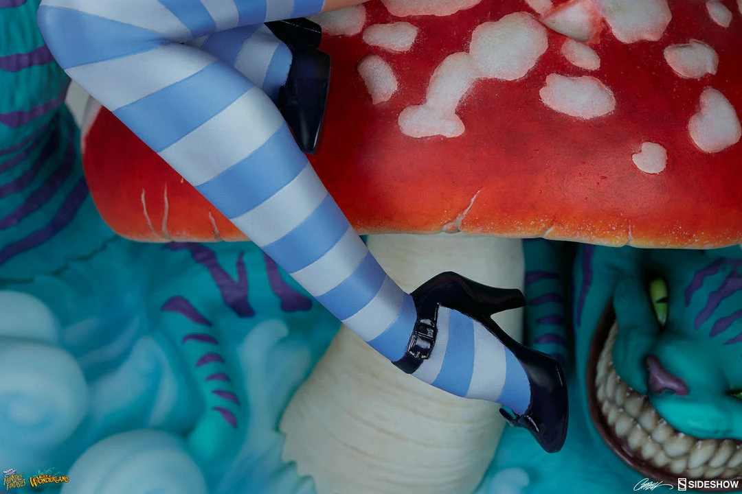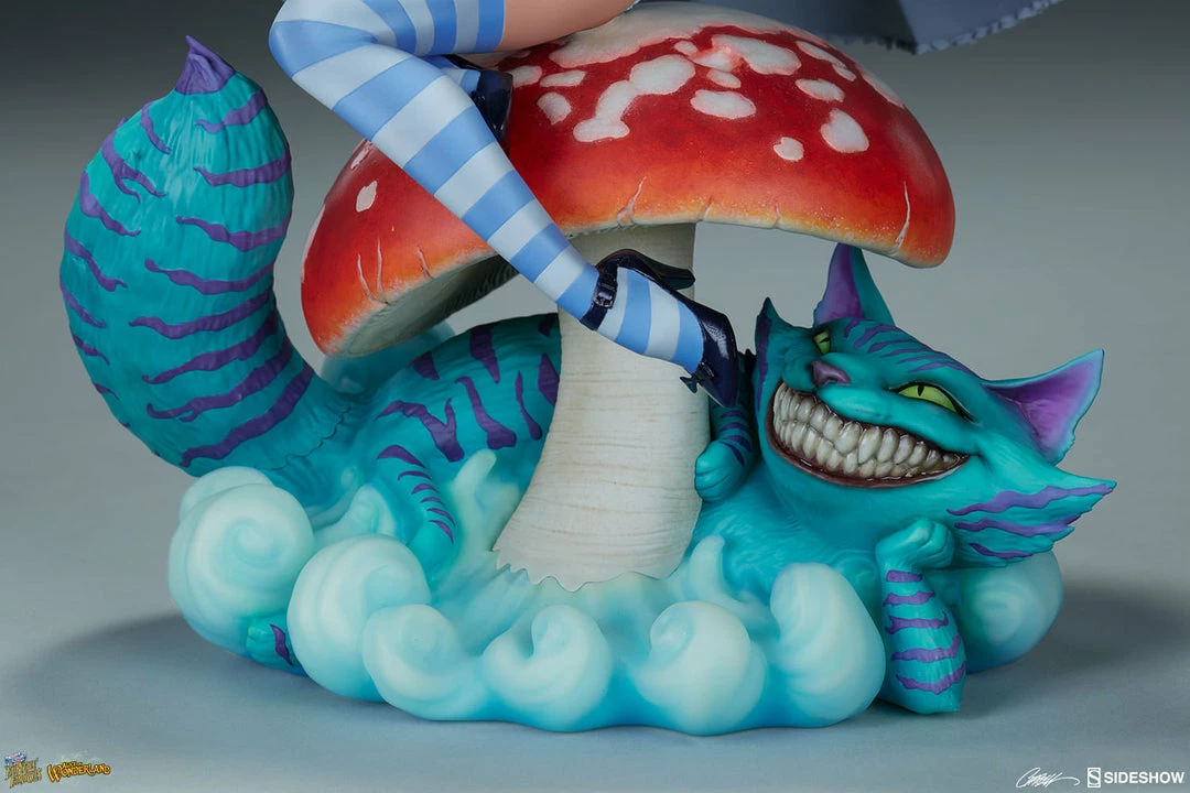The Alice in Wonderland Statue measures 13.5” tall, as Alice sits atop a red dappled mushroom in the midst of the magical world of Wonderland, holding two segments of the size-changing toadstool in either hand. From the base of the figure, the blue and purple Cheshire Cat gives its famous toothy grin as it cleverly blends into the whimsical environment.