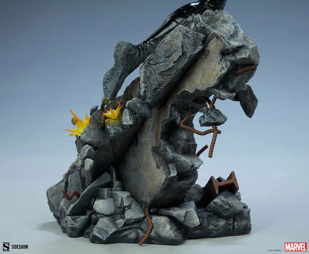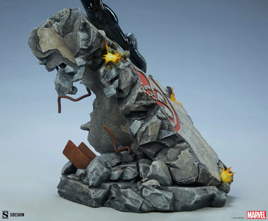 The Black Widow Premium Format Figure measures 23” tall as Natasha Romanoff slides down the wall of a secret Hydra facility base, dodging orange bursts of enemy fire since stealth is no longer an option. Her signature red hair flows dramatically as she makes a daring escape through rocky debris, firing off blue electroshock blasts from her Widow’s Bite bracelets. Hydra won’t know what hit them!