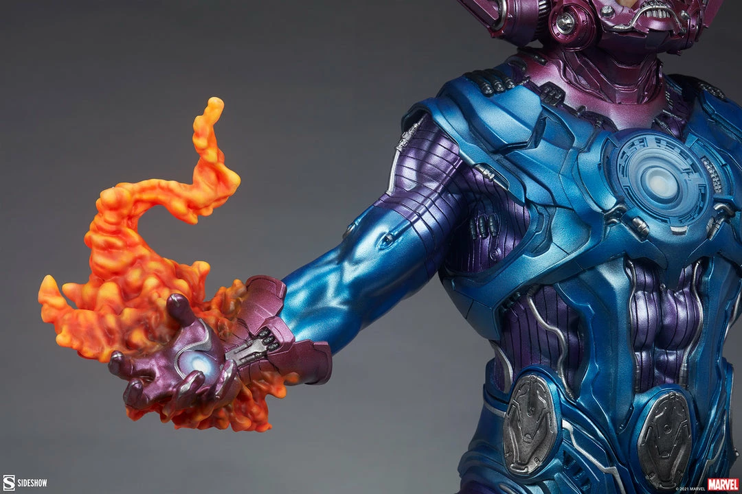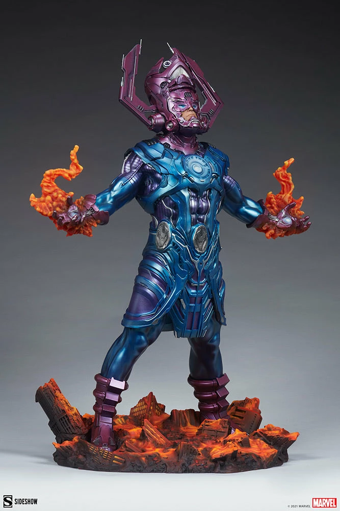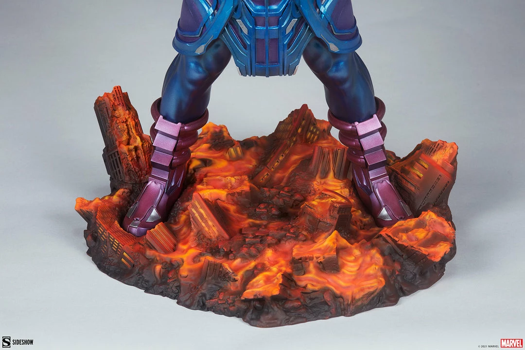 The Galactus Maquette stands 26” tall, towering over an annihilated city landscape where buildings melt beneath his boots as he wields the fiery force of the Power Cosmic. Heralded by his loyal servants, Galactus brings naught but devastation in the endless quest to feed his planetary hunger, and this ill-fated world is simply one of many he must consume to maintain his godly strength.