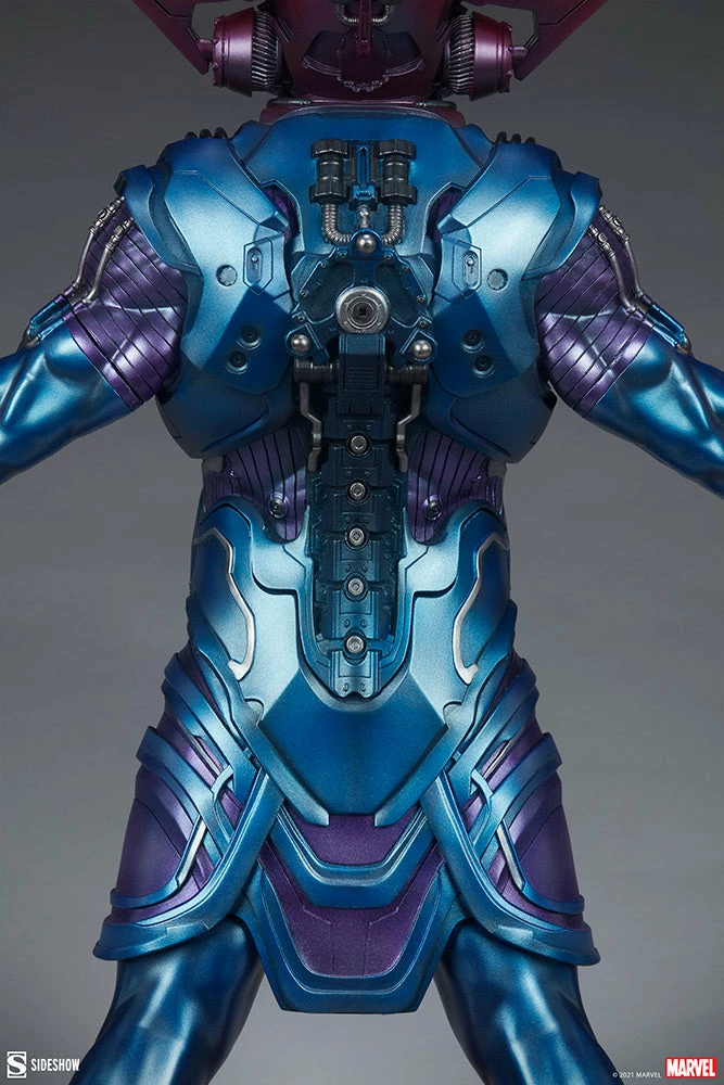 The polystone Galactus Maquette is a fully sculpted marvel of intricate armor and otherworldly might. Inspired by his iconic appearance in Marvel Comics, this maquette features an immensely detailed metallic blue and purple costume with silver accents, capturing the futuristic appearance of the unstoppable Galactus. His signature helmeted portrait reveals a hint of the man who became a god, known throughout the multiverse as the Hunger that Does Not Cease. With his intimidating physique, crackling heat effects on his hands, and an unrelenting need to draw strength from the cosmos, Galactus is sure to make a world-shattering centerpiece on any shelf.