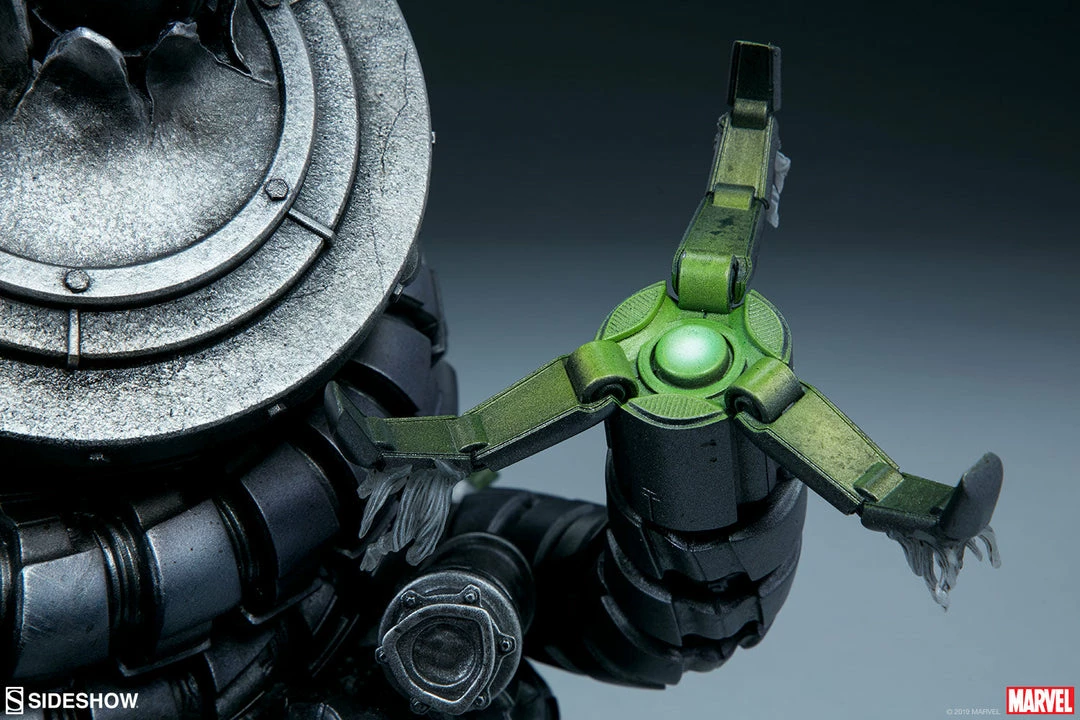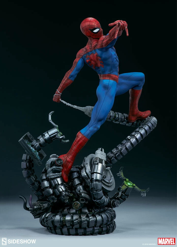 Just another day at the lab! The Spider-Man Premium Format™ Figure measures 22.5” tall as everyone’s favorite web-head wrestles with the tentacles of his foe Doctor Octopus on an Oscorp Laboratories-themed base. Peter Parker expertly avoids Doc Ock’s clawed clutches as the robotic arms coil around mangled monitors and machinery in an attempt to snare him.
