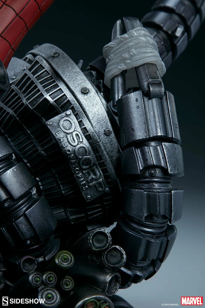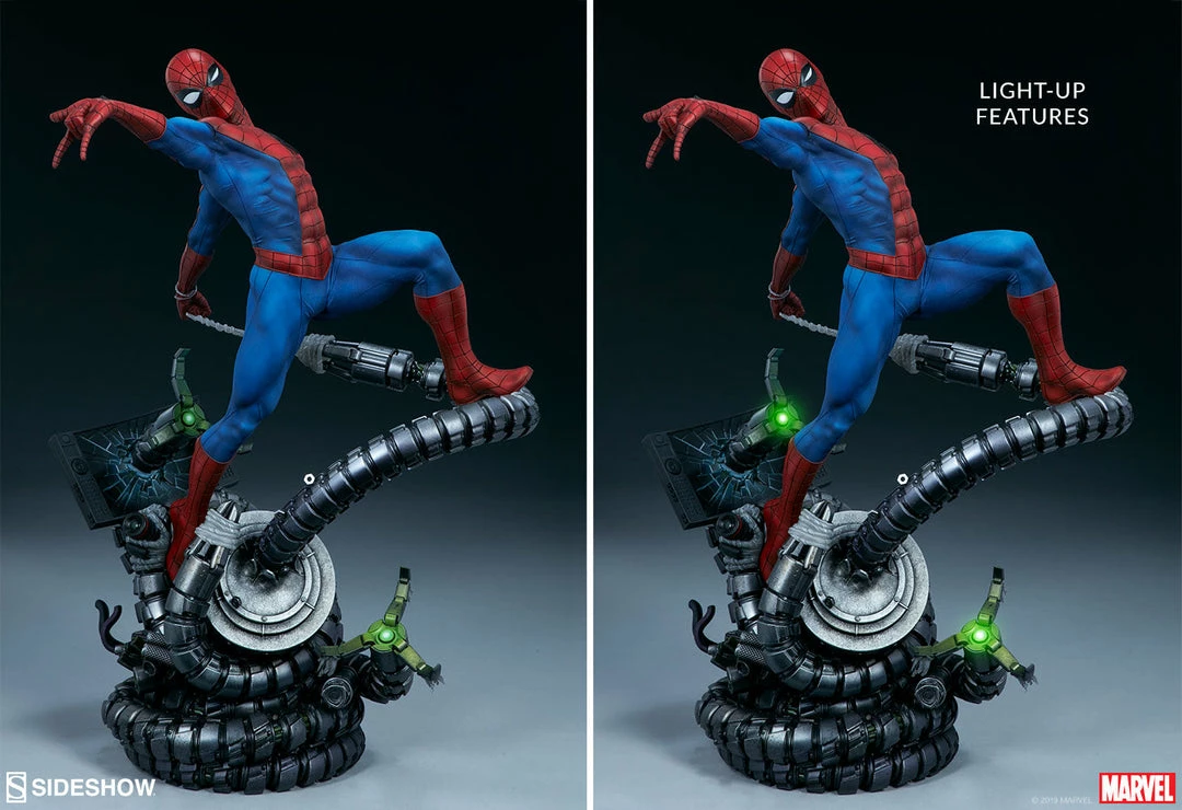 The polystone Spider-Man Premium Format Figure™ features a sculpted blue and red costume with varied textures and webbing elements on the gloves, boots, mask, and torso. The Spidey suit showcases Peter Parker’s athletic physique, with detailed musculature and realistic fabric-like movement. A number of webs wrap around the mechanical tentacles on the base, clamping the deadly claws shut and hiding Parker’s camera in the fray. The two open claws also include a light up feature, adding a sinister green glow to the scene.