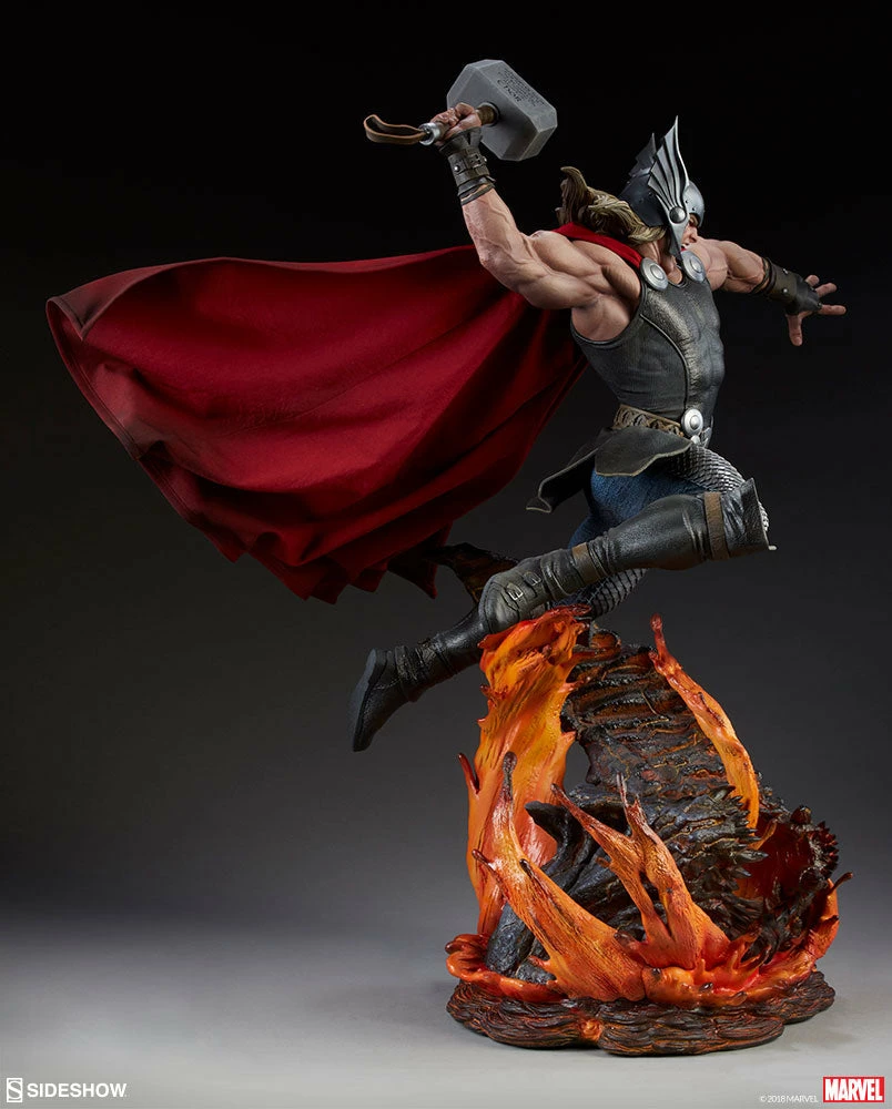 The Thor: Breaker of Brimstone Premium Format™ Figure measures 25.5” tall, as the God of Thunder summons the strength of Mjolnir to fight his molten foe Surtur. As Thor descends into the realm of Muspelheim, plumes of lava erupt from around the fire giant-themed base.