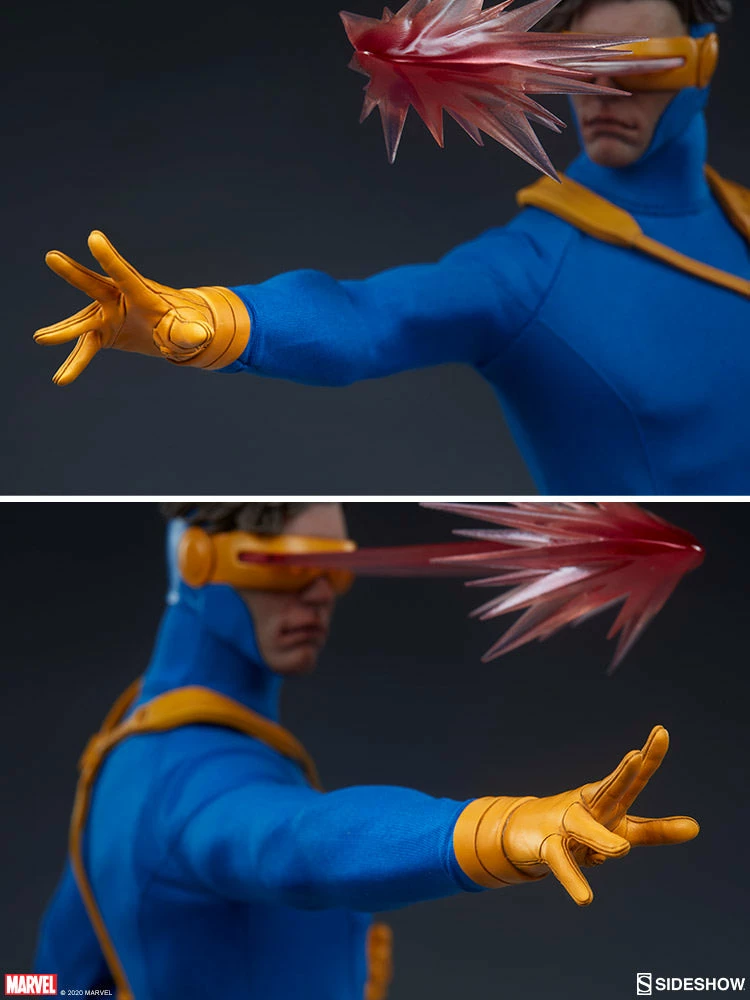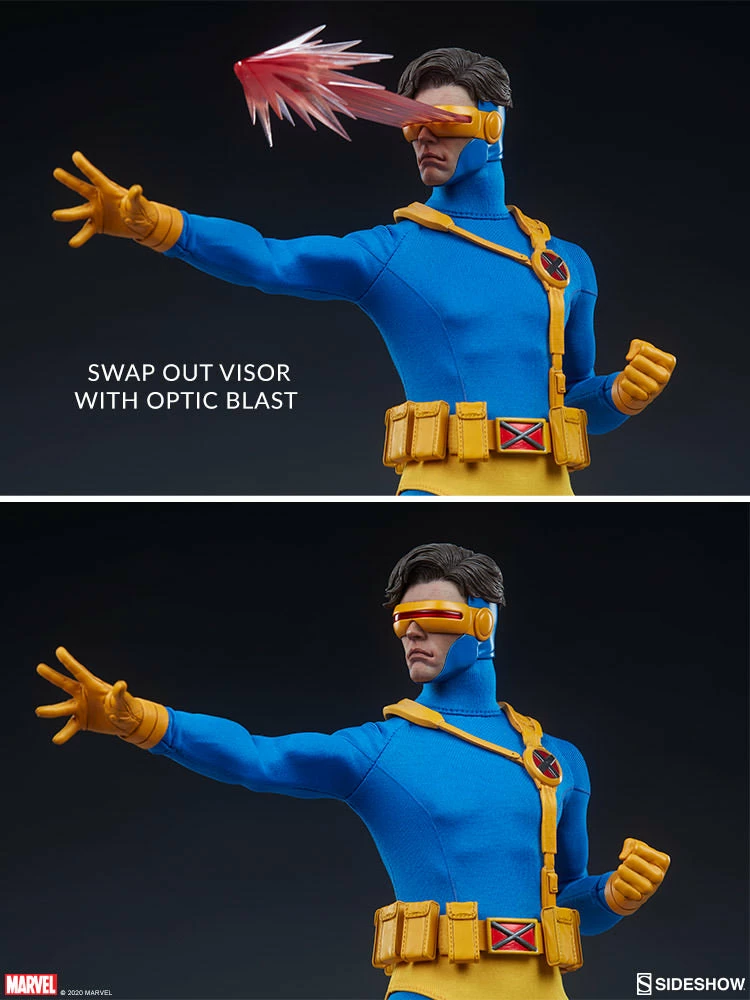 The Cyclops Sixth Scale Figure features a number of swap-out elements that allow you to create an action-packed pose for this articulated figure. Scott Summers comes with seven different yellow gloved hands, including one pair of fists, one pair of open hands, one pair of pointing hands, and one left thumbs-up gesture hand. Create an even more dynamic display with the included swap-out visor with an optic blast effect, which adds some serious concussive force to any pose configuration.