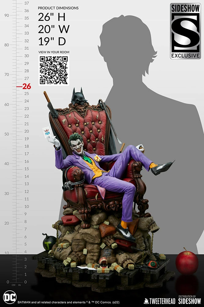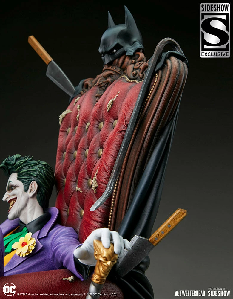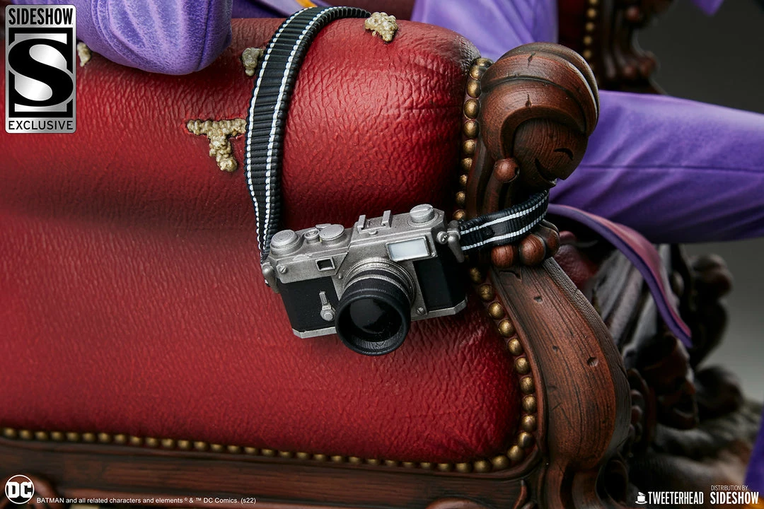 The Joker 1:4 Maquette measures 20” wide and about 26” tall when fully assembled — from the bottom of the base to the tippy top of the Batman’s cowl draped across the Clown Prince’s chair. This fully sculpted polyresin statue comes crammed with a bunch of trophies and toys from The Joker’s Gotham City escapades.