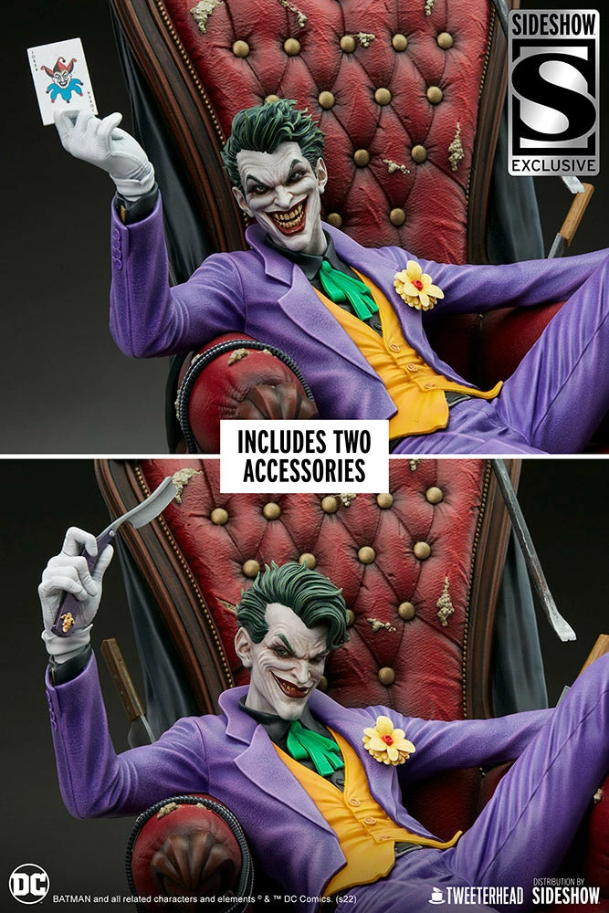 Armed with his gilded cane, a playing card, and bladed dress shoes, The Joker sits atop his personalized throne. He teeters precariously on a giant pile of spoils including money bags, gasoline tanks, bombs, and endless knick-knacks and knives. The maquette also includes an additional right hand holding a blade and an additional alternate style portrait, creating four total different ways you can display your newest Joker collectible. With so many Easter eggs and details, you’ll always find something new to love in this villainous piece!