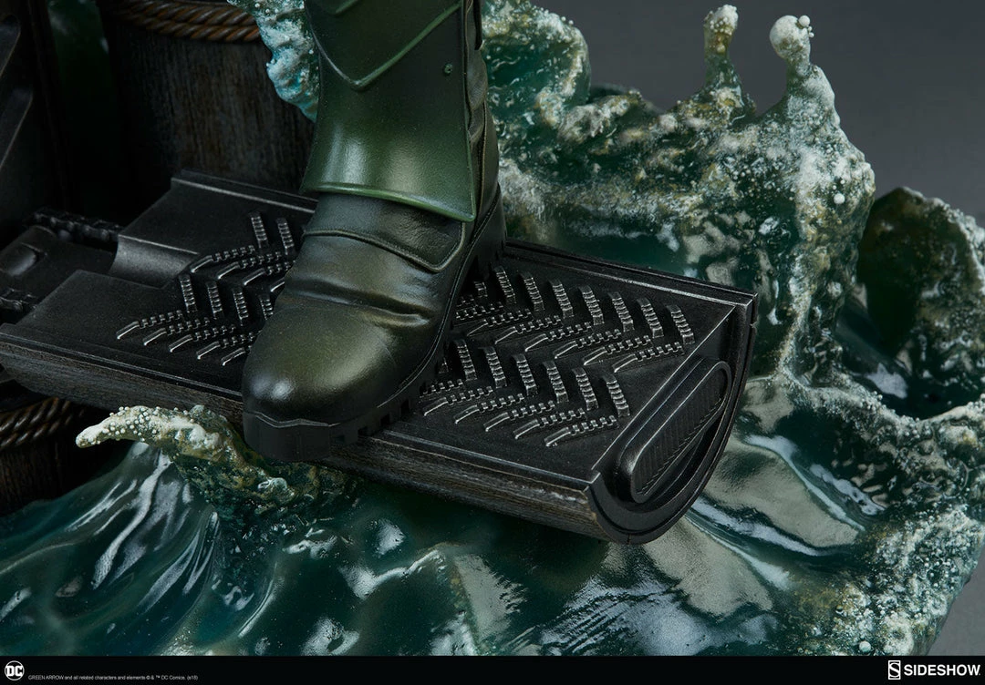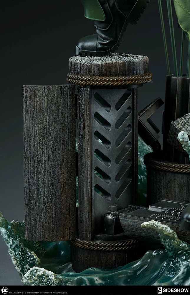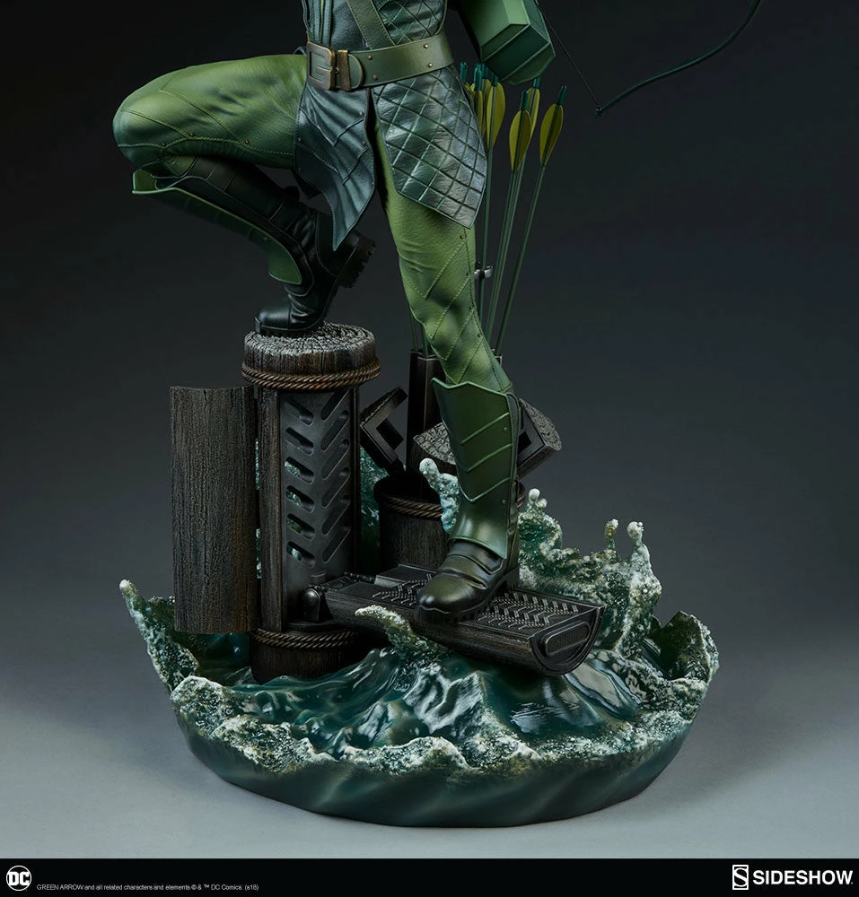 Green Arrow measures 25” tall, standing on a base featuring one of the hero’s hidden caches of arrows, essential for defending Star City. As Oliver Queen draws his bow, sculpted waves churn beneath the bowman’s green boots.