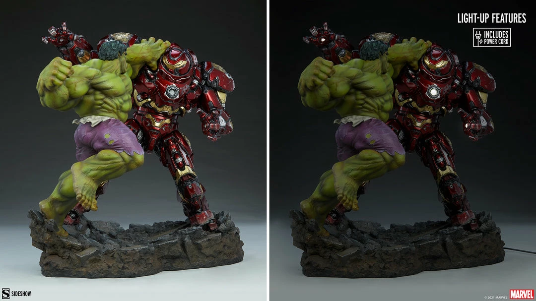 The Hulk vs Hulkbuster Maquette measures 19.5” tall and 21.6” wide, standing on top of a rubble-themed base. This polystone Marvel statue features two fully sculpted figures interlocked in an epic battle. Marvel’s Jade Giant, the Hulk, is incredibly muscled and detailed with sculpted purple pants, realistic textures and colors throughout his irradiated complexion, and a roaring portrait as he winds up his next hit. The Hulkbuster is a meticulous recreation of Tony Stark’s signature tech, with intricate defense paneling, weathered effects, and a light up feature in the eyes, arc reactor, and hand repulsors. Activate the armor in your collection with the included power cord and add another level of realism to this smashing scene!