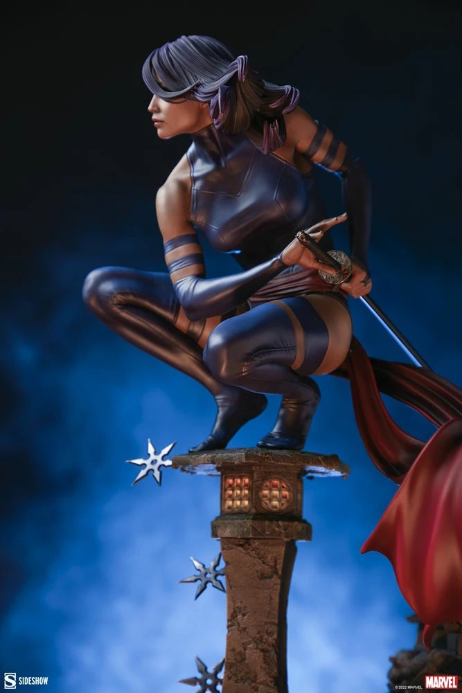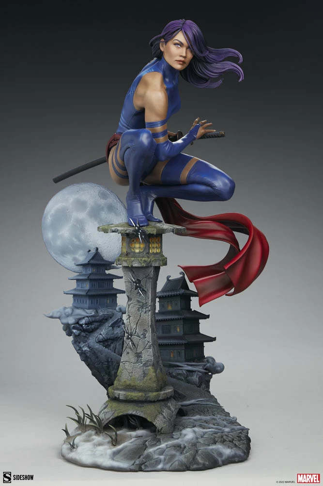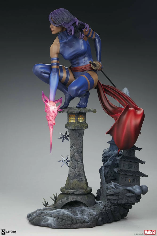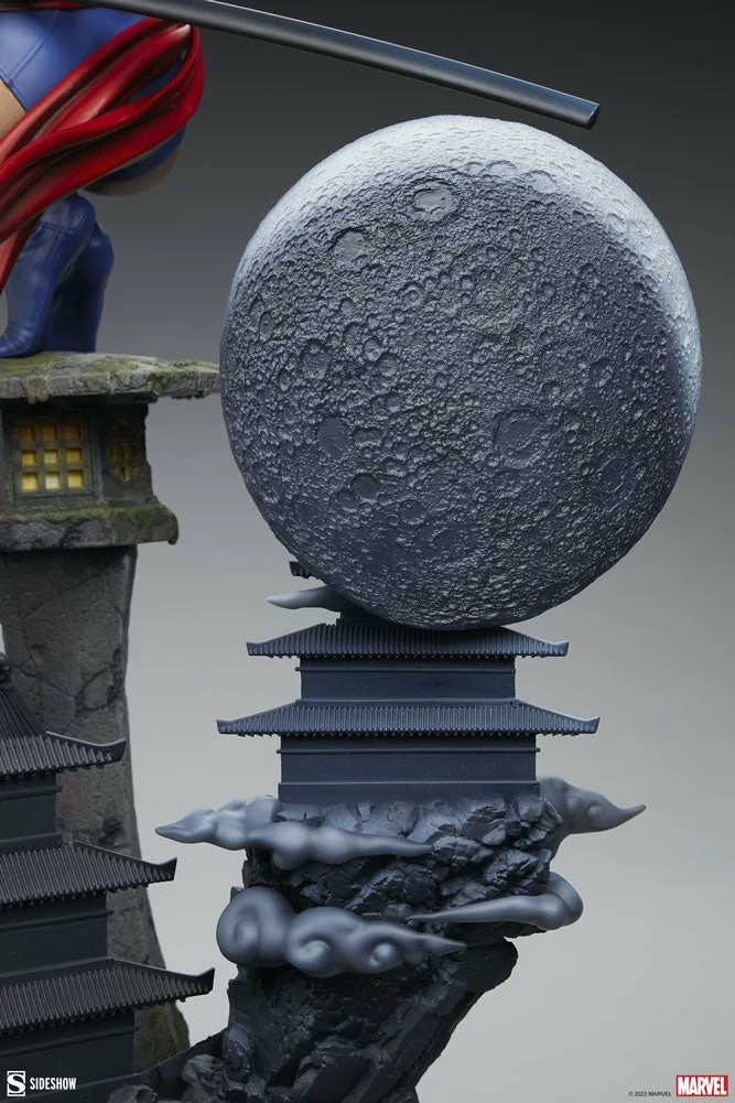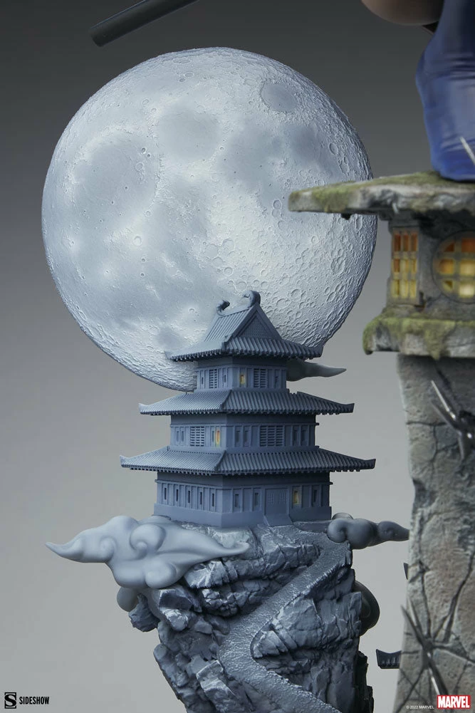 Beautiful and deadly, this psychic mutant is on a moonlit mission of vengeance. The Psylocke Premium Format Figure measures 21” tall and 13.41” wide in a dazzling scene with a unique forced perspective backdrop. Psylocke crouches atop a stone lantern riddled with shuriken that have missed their elusive target. The psionic blade weapon on her right arm emanates the butterfly-shaped effect of her powers. Beyond her, the full moon rises and casts light and shadow across a pair of pagodas that sit further up the mountain path.