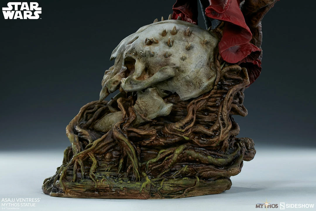 The Asajj Ventress Mythos Statue measures over 22” tall as the lethal Nightsister stands poised on the growths of a Dathomirian swamp base. Beneath her feet lies a Ssurian skull snared in the vines of her home planet’s native flora as the Sith assassin wields her dual red lightsabers in preparation for battle.