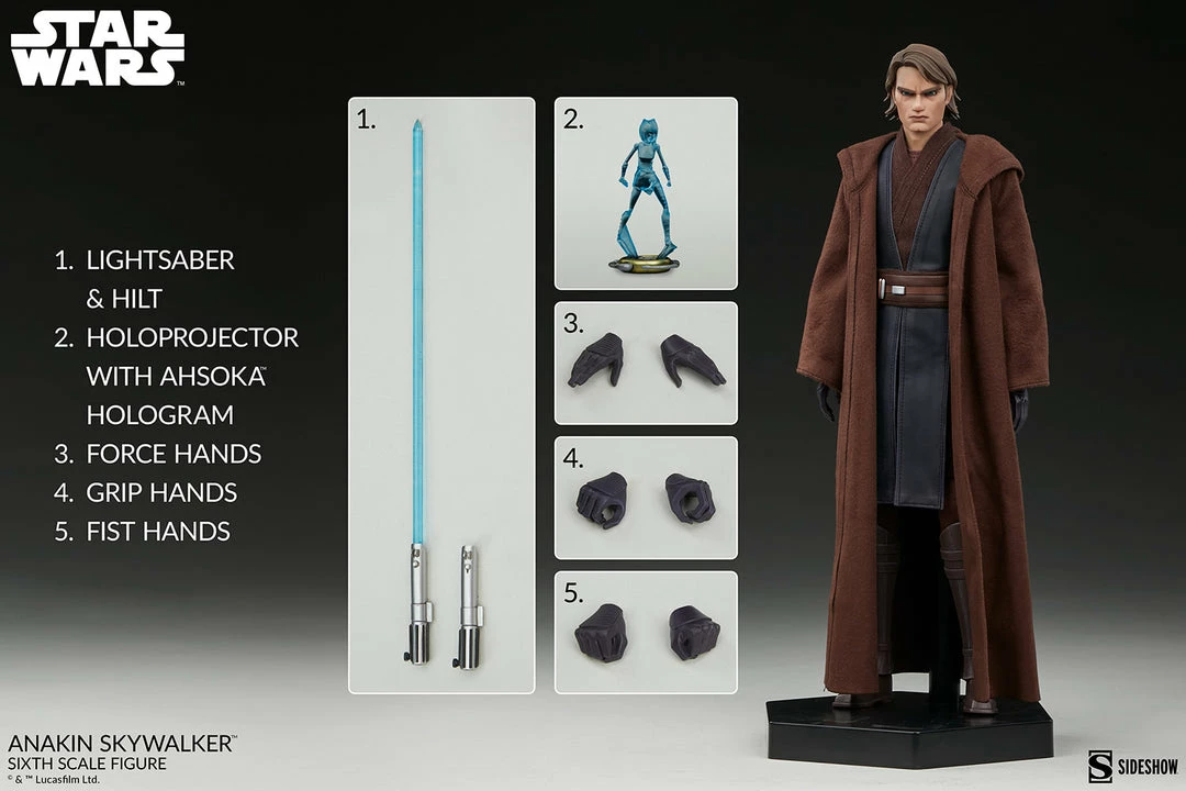 The Anakin Skywalker Sixth Scale Figure includes a number of stylized hands and swap-out accessories to give collectors a wide range of display options for the Jedi general. Anakin Skywalker comes with four pairs of stylized hands including a pair of grip hands, a pair of neutral hands, a pair of force hands, and a pair of fists for a wide variety of gestures and pose combinations. In addition, he comes with both a lightsaber hilt and lightsaber with its blue tapered blade unleashed for battle action. Finally, Anakin includes a holoprojector accessory with a sculpted Ahsoka Tano™ hologram for communicating with his Padawan.