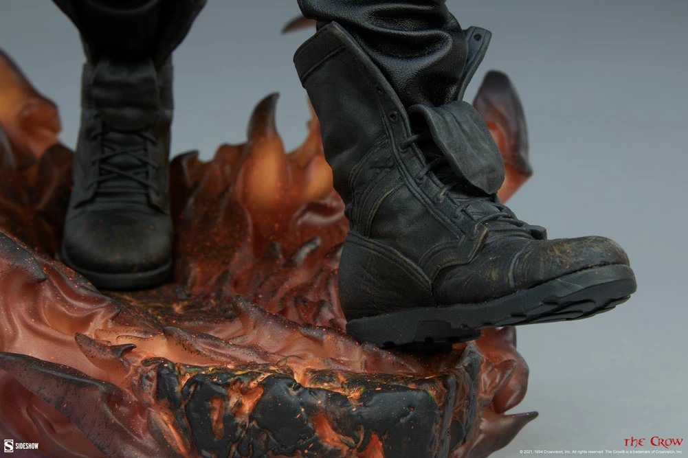 The Crow Premium Format Figure measures 22” tall and 11.38” wide as Eric Draven, fresh from the grave, stalks through raging flames to exact his revenge on the men who ruined his life. Based on the likeness of actor Brandon Lee in the unforgettable role, the undead antihero rests a shotgun on his shoulder while the mysterious crow guides his vindictive path, wings outstretched. His portrait features his iconic face makeup, sculpted hair, and a somber look encapsulating his tragic transformation.