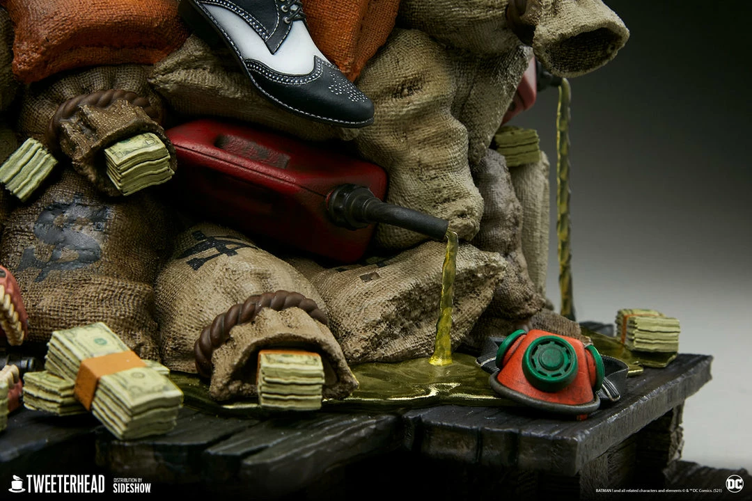 The Joker Deluxe Maquette measures close to 20.5” tall when fully assembled – from the bottom of base to the tippy top of the Batman’s cowl on the chair. This fully sculpted polyresin statue comes crammed with a bunch of craziness – Joker sitting atop his personalized throne with a Bat-cowl and cape, armed with his cane and bladed shoe. All nested on a giant pile of money bags, gasoline tanks, bombs, and endless knick-knacks and easter eggs, you’ll probably never stop finding something new to love in this piece.