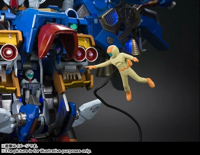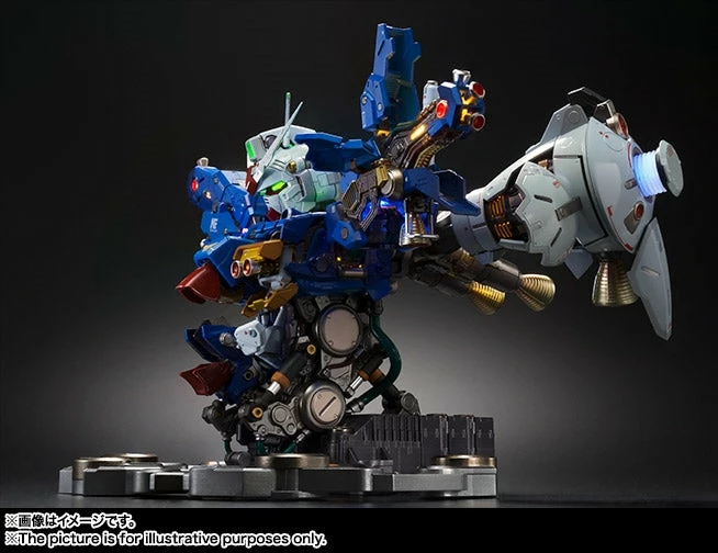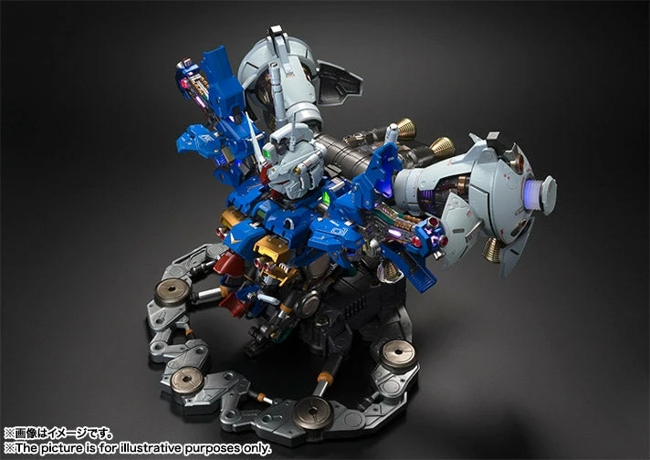 It features sixteen internal LED lights that not only illuminate features such as the eyes and sensor units, but also spotlight internal details. The cockpit is fully portrayed for added realism. Hatches can be posed open to reveal mechanical features illuminated by changing multicolor LEDs (8 locations). The display is designed to evoke the appearance of the Full Burnern equipped “Zephyranthes” in the OVA series “Mobile Suit Gundam 0083.” Includes two arm-mounted LED searchlights, and three minifigures