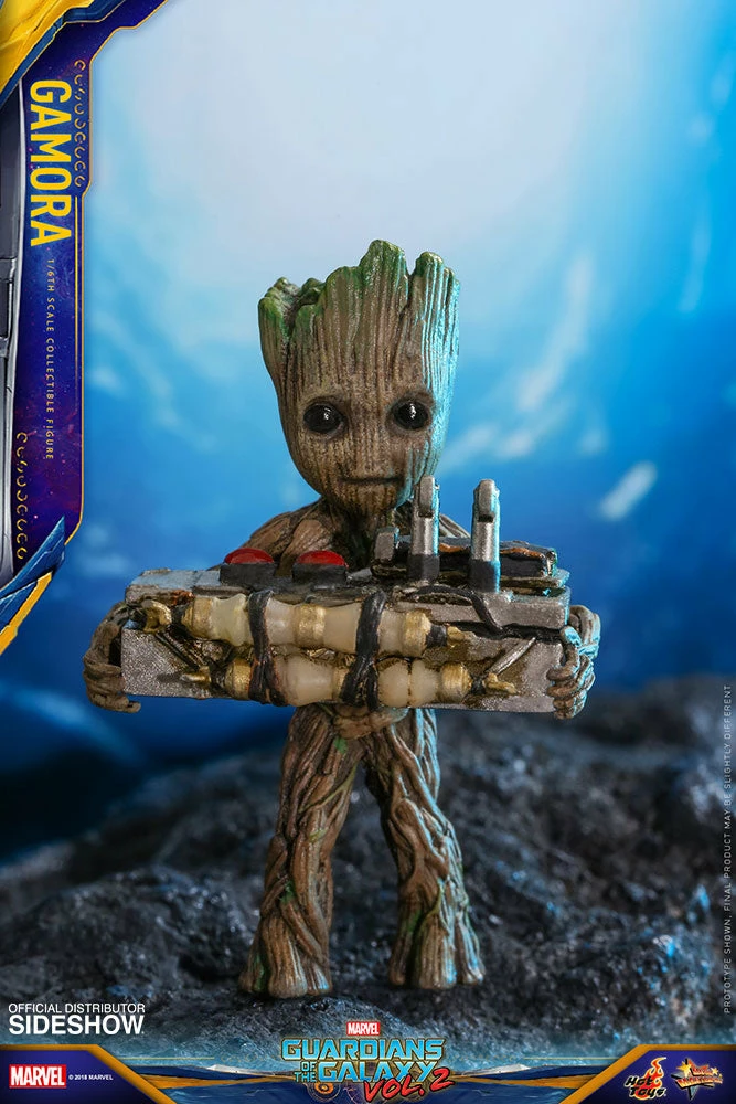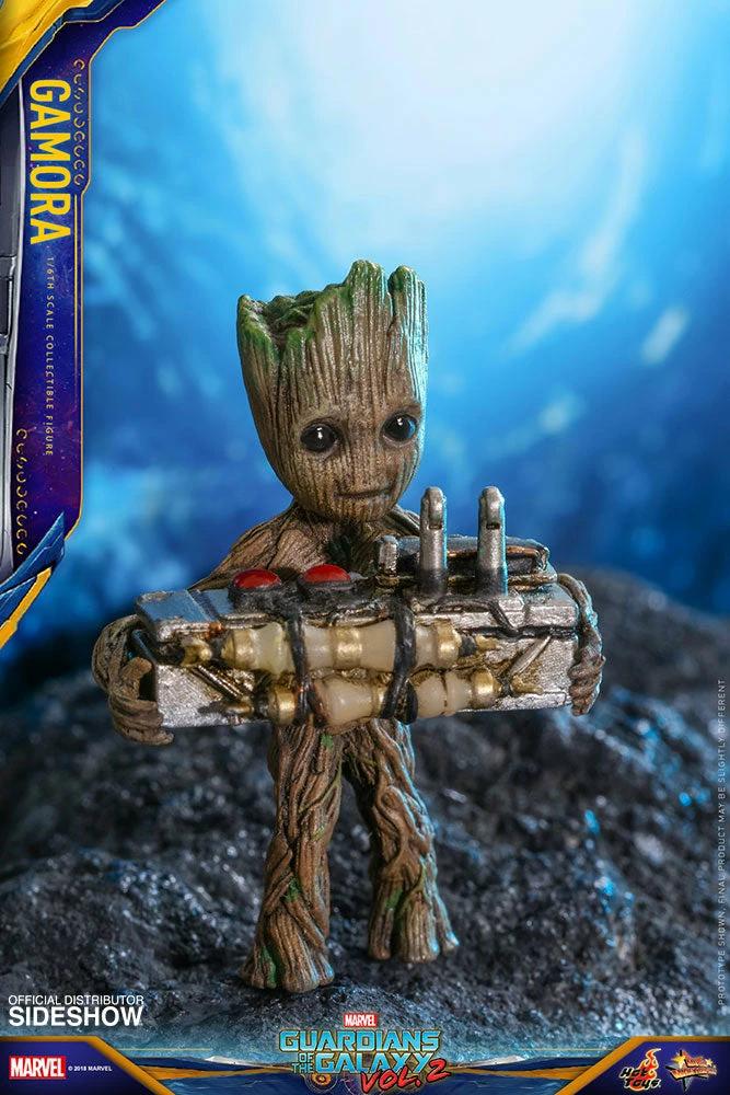 The new Gamora sixth scale collectible figure is expertly crafted based on the image of Zoe Saldana as Gamora in the film. The figure features a newly developed head sculpt with long curly black and purplish-red real fabric hair, a finely detailed costume including a meticulously tailored leather-like coat. This collectible also comes with a sword, a folded up sword, a blaster, an interchangeable long sleeve tee, an Aero Rigs armored with a chest plate, a miniature Baby Groot holding a bomb and a movie-themed figure stand!