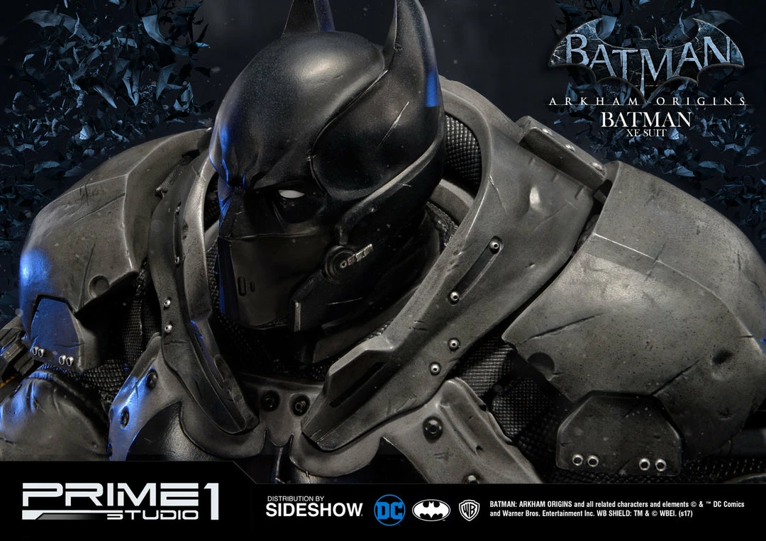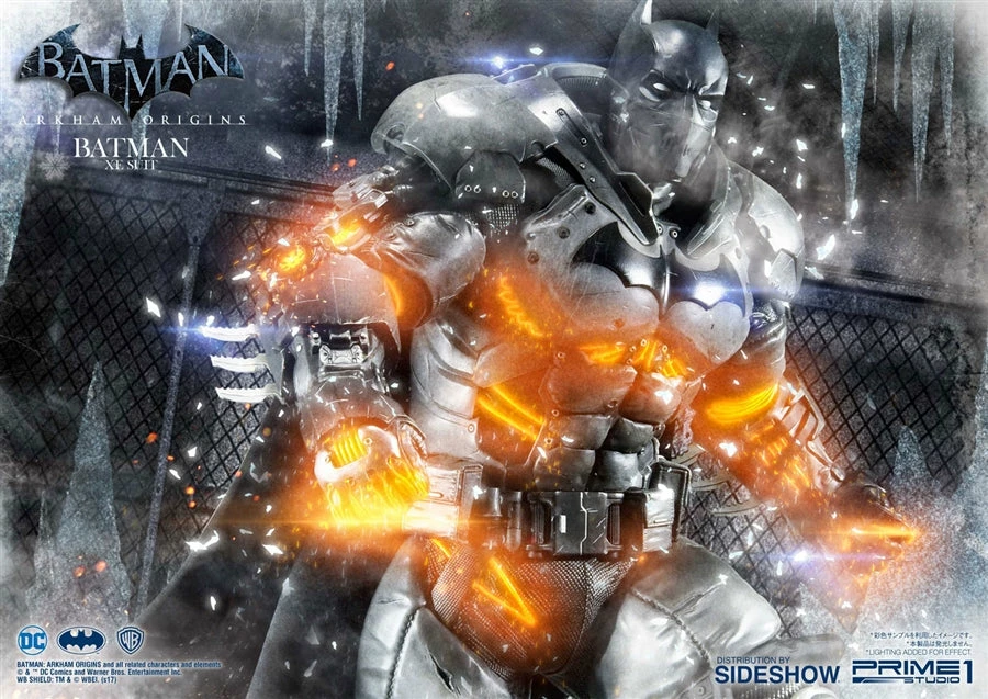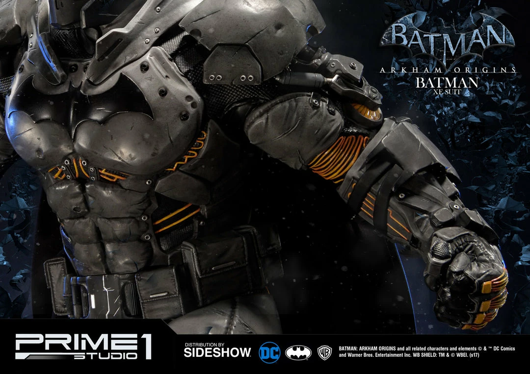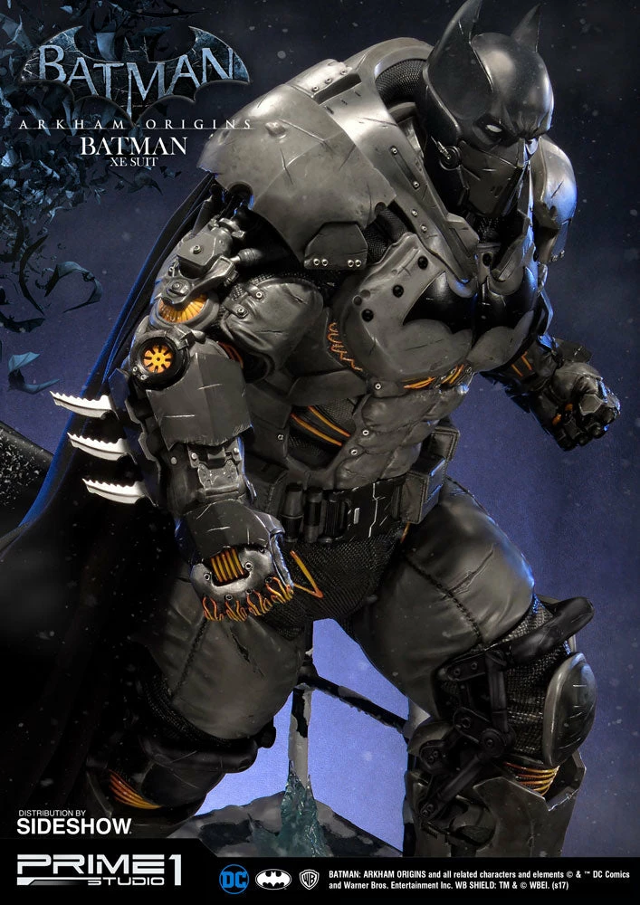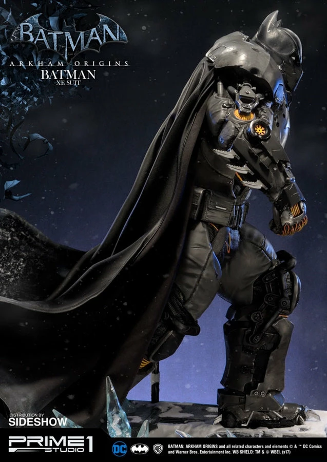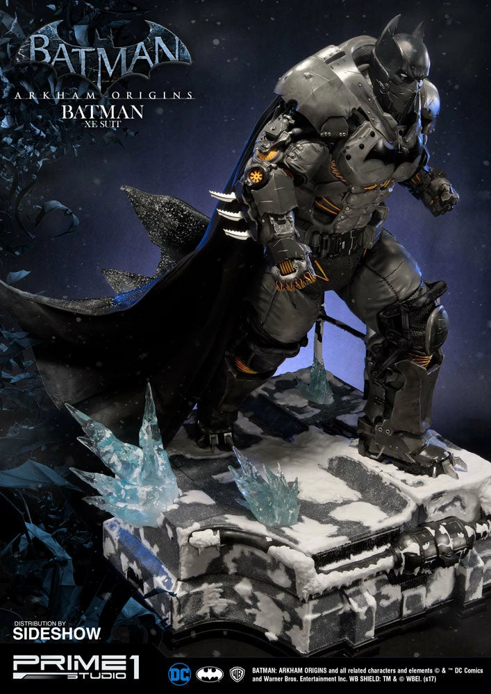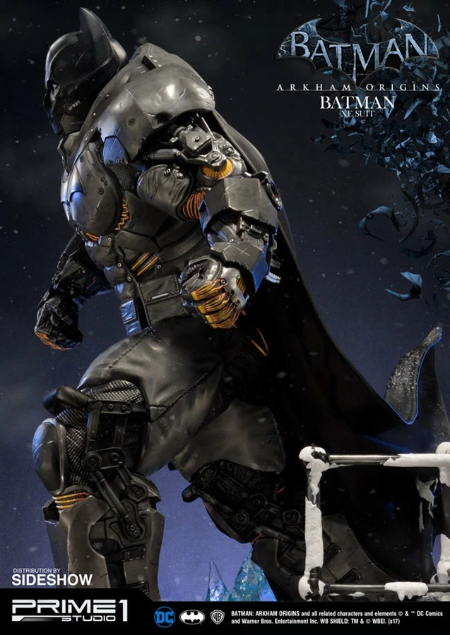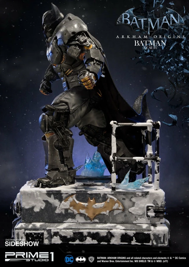Sideshow and Prime 1 Studio are proud to present the Batman Extreme Environment Suit from Batman: Arkham Origins (Cold, Cold Heart DLC). Batman started out using the Arkham Origins Batsuit but switched to the XE Suit after he realized that he needed a more armored Batsuit to take on the likes of Mister Freeze. It had heating on some of the areas of the suit, it was armed with Thermal Gloves. This special version of his Batsuit not only offered him greater protection but also allowed him to take Mr. Freeze head on as the suit was able to withstand the extreme temperature and break the ice he was able to create. A perfect duo with the Mr. Freeze from Batman: Arkham Origins.