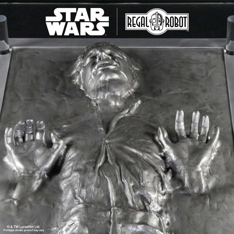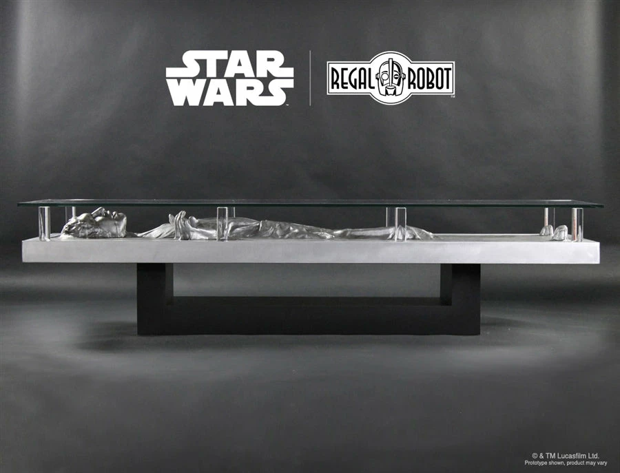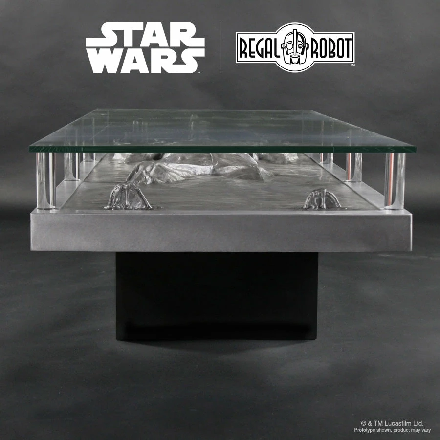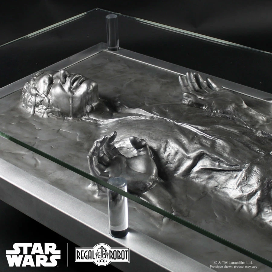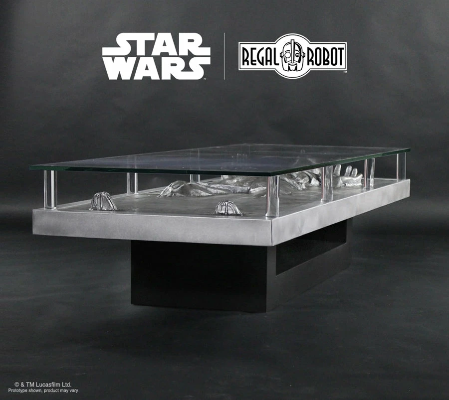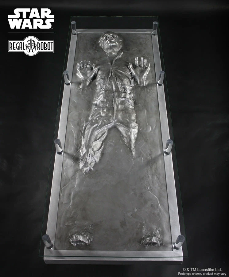 Best of all, the coffee table features a life-size interpretation of Han Solo encased in carbonite!