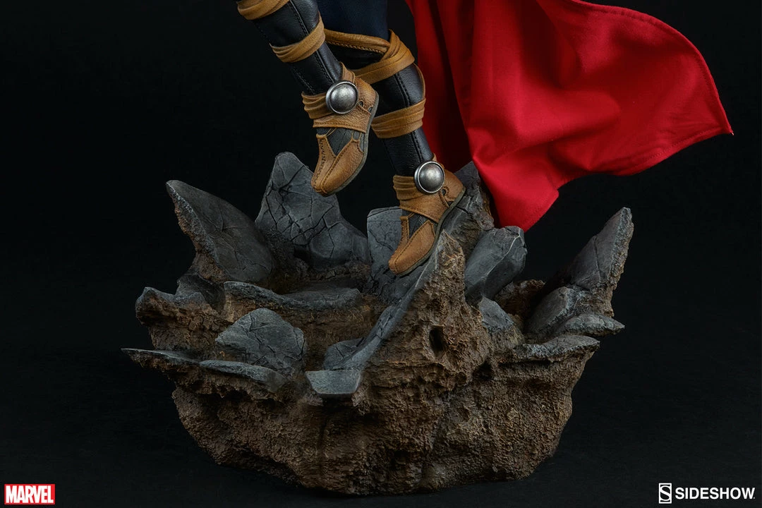 Every inch of this classic Thor portrait has been crafted with loving detail. From the creases and folds of his meticulously sculpted garb and every wrinkle in his wire-lined fabric cape to the bulging muscles of his godlike physique and his flowing blonde locks.