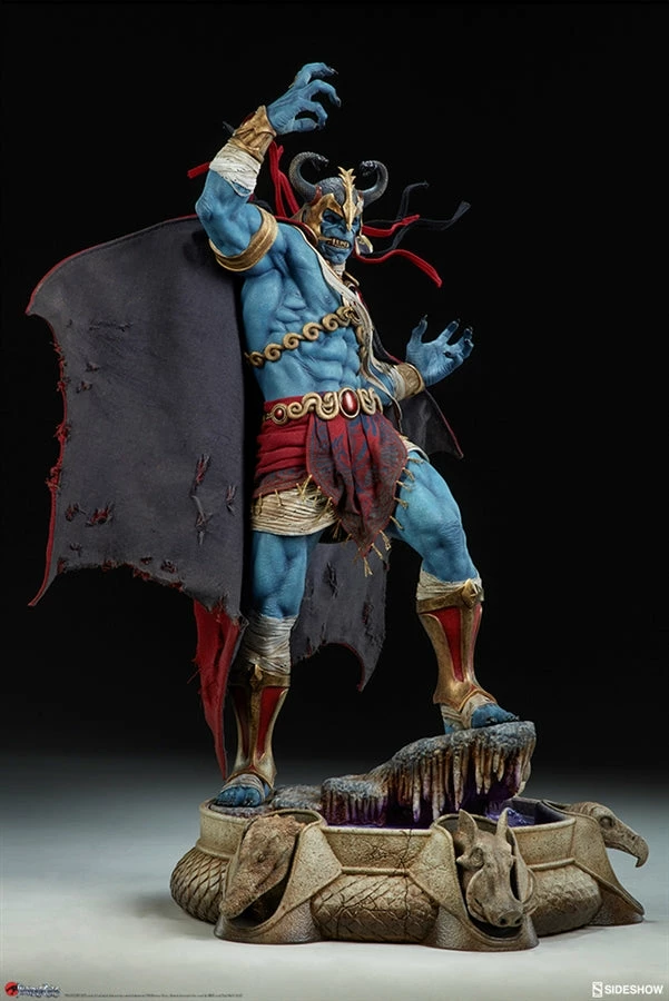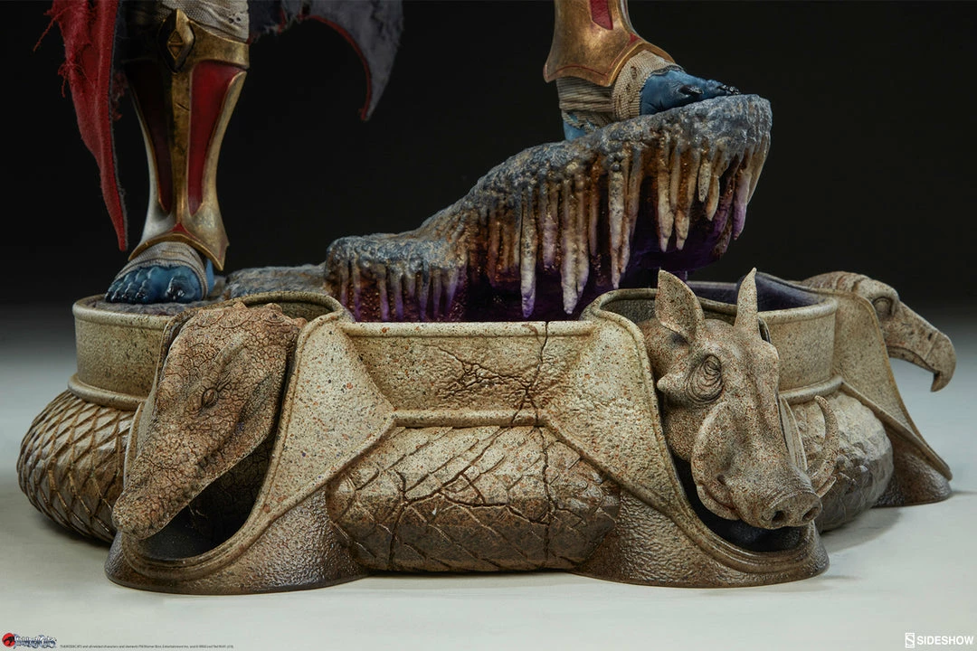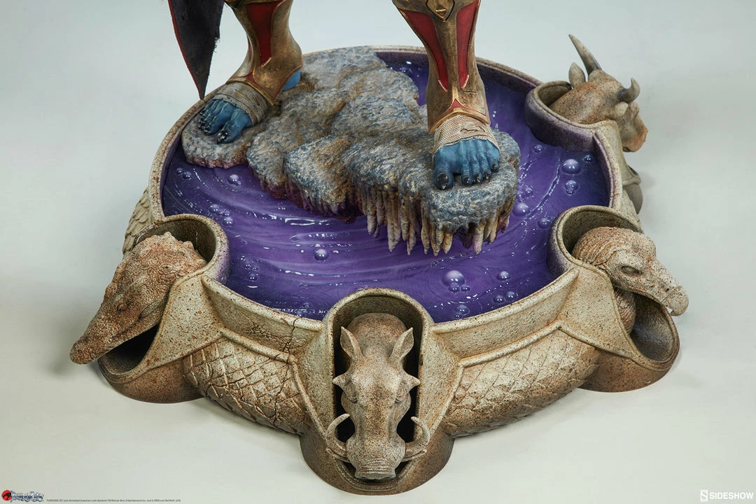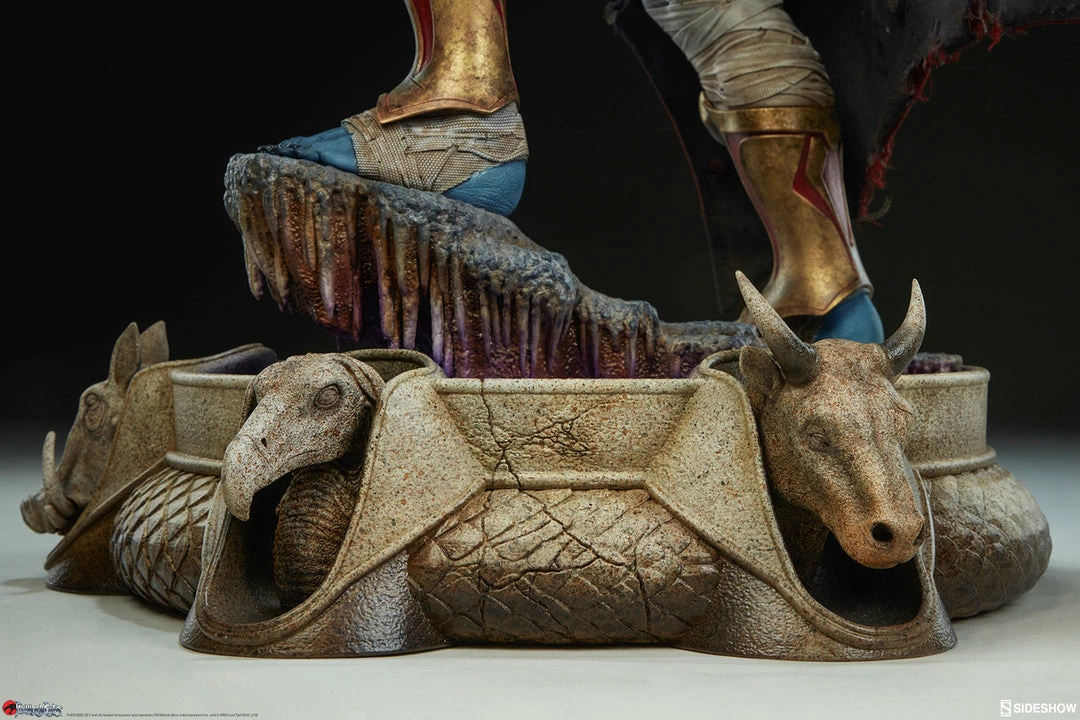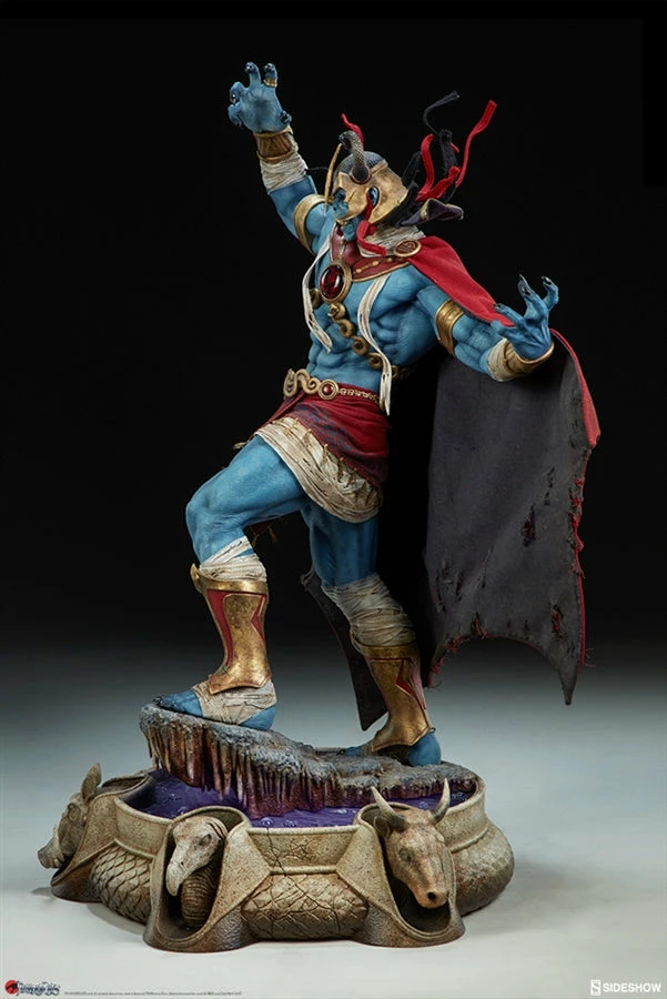 Mumm-Ra stands 22 tall atop a Black Pyramid themed base, surrounded by effigies of the Ancient Spirits of Evil, who he is bound to serve. A purple pool of magic boils beneath his feet while the portraits of a crocodile, a boar, a vulture, and an ox imbue him with terrifying power.