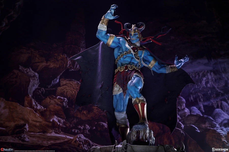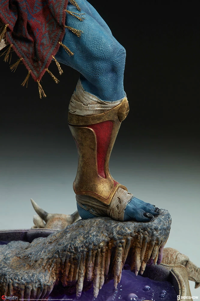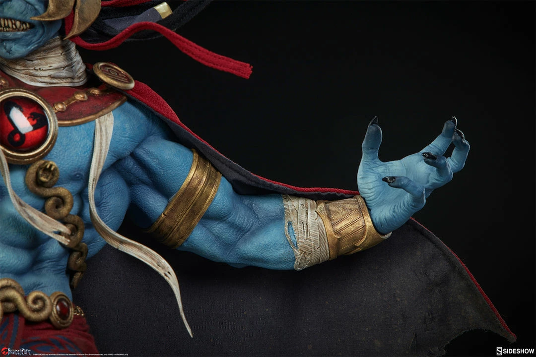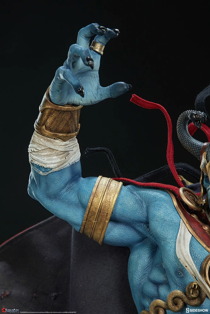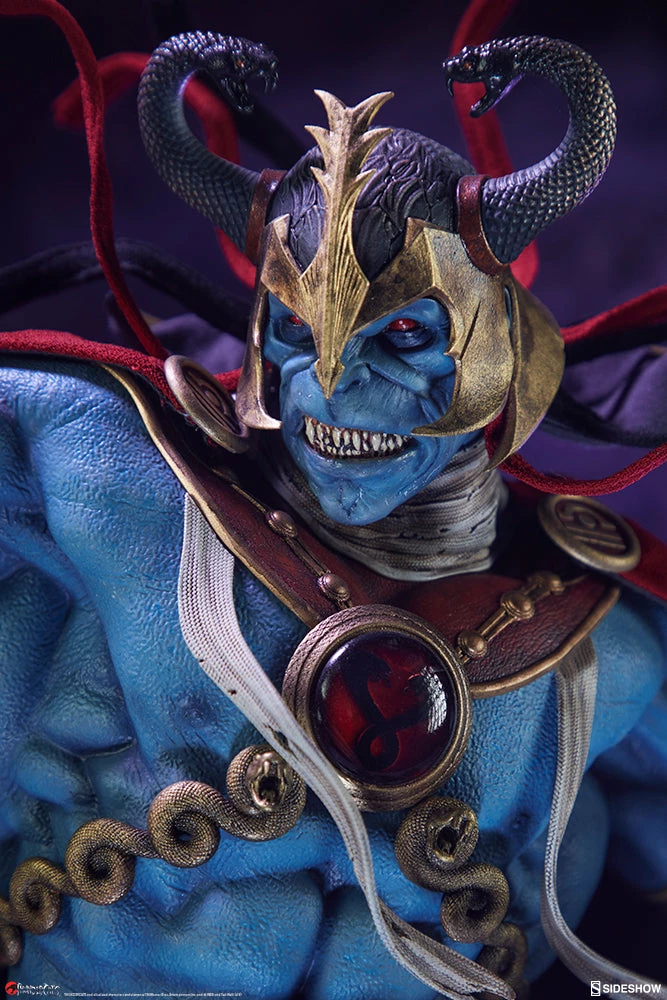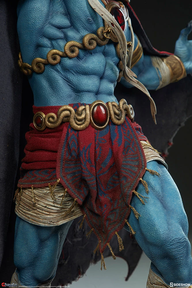 Transformed into his Ever-Living state, the menacing Mumm-Ra has a portrait inspired by his animated appearance, with red eyes and jagged teeth. The Mumm-Ra Statue has a polystone blue body, sculpted with lifelike texture to capture his immense strength. He has sculpted armor elements, including his bandage wraps, golden gauntlets, and snake-themed belt and chains.