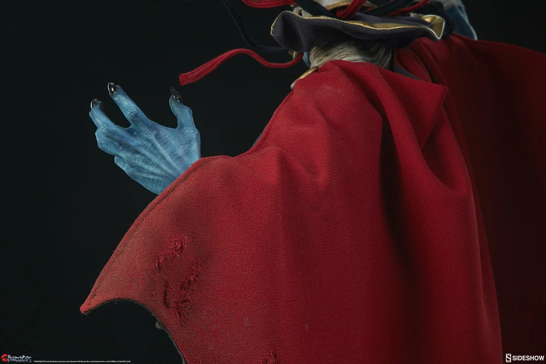 Mumm-Ras snake helmet has wired red and black tendrils of fabric on a tailored headdress. The statue also includes a fabric skirt and a red and black fabric cape, detailed with weathering to reflect the decay of the dangerous villain. The scalloped cape includes internal wiring for custom posing options.