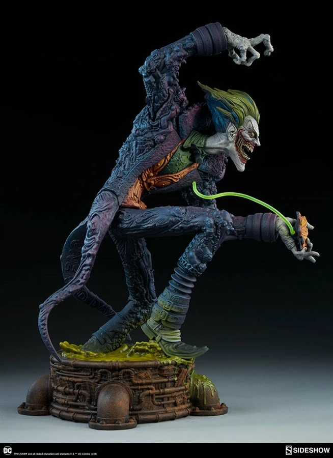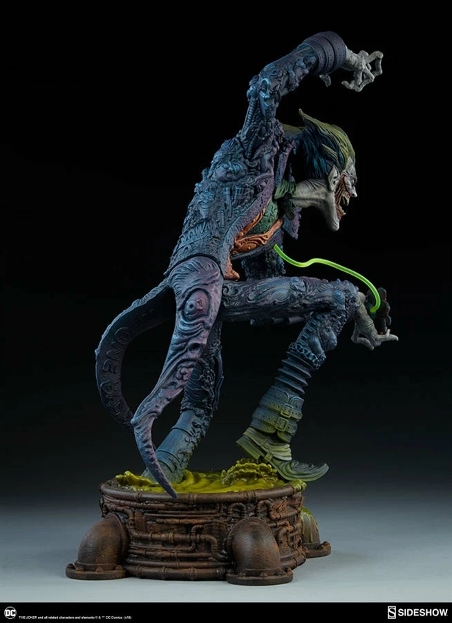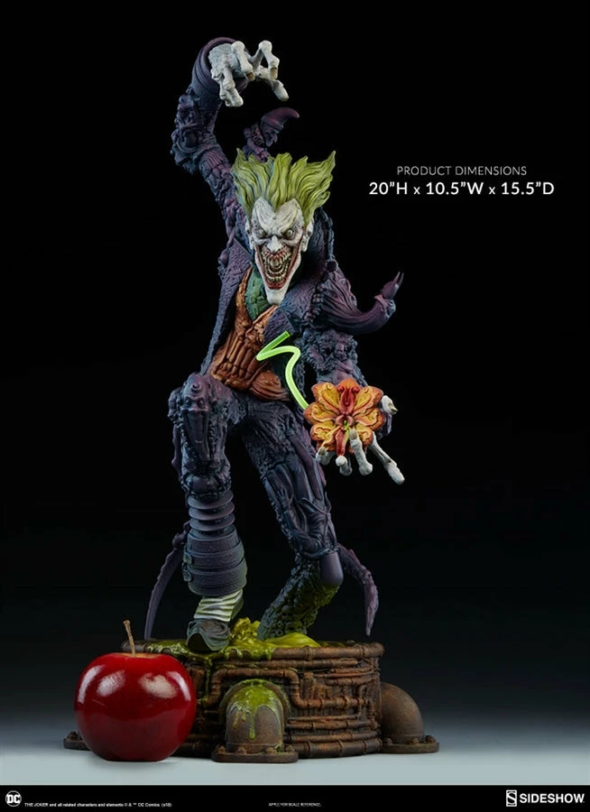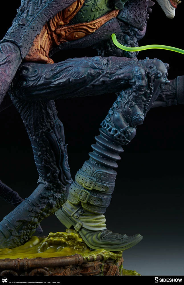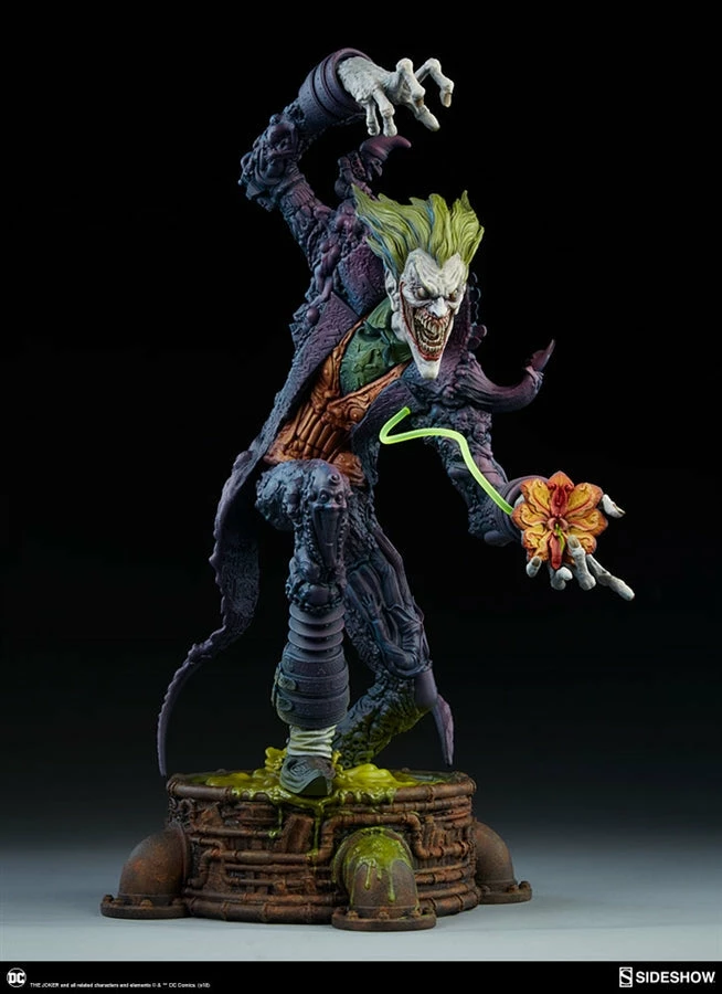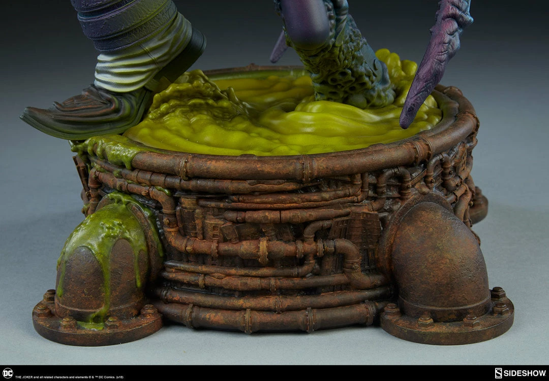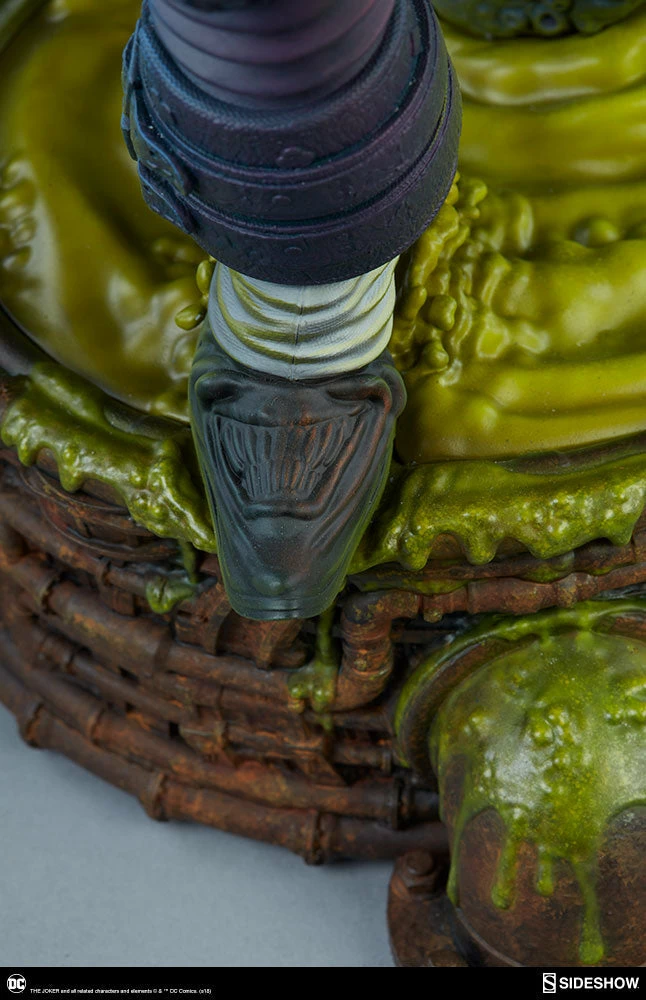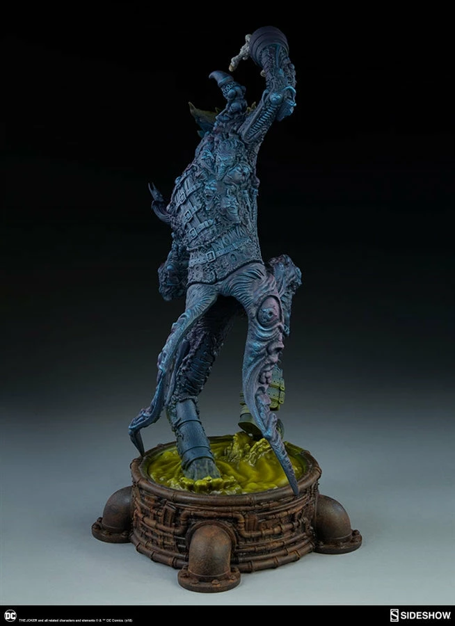 The Joker Statue measures 20 tall, emerging from a chemical vat filled with venomous green acid. Beneath copper-colored pipes, the architecture of Gotham City can be seen laying the groundwork for the rise of this nightmarish Clown Prince of Crime.