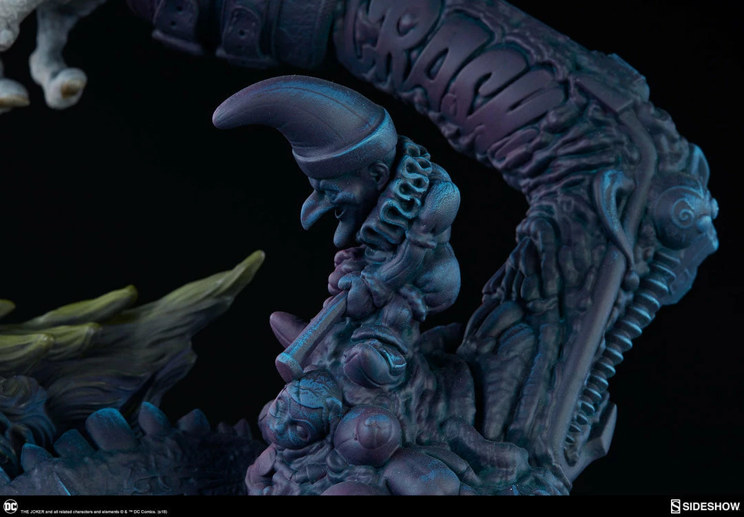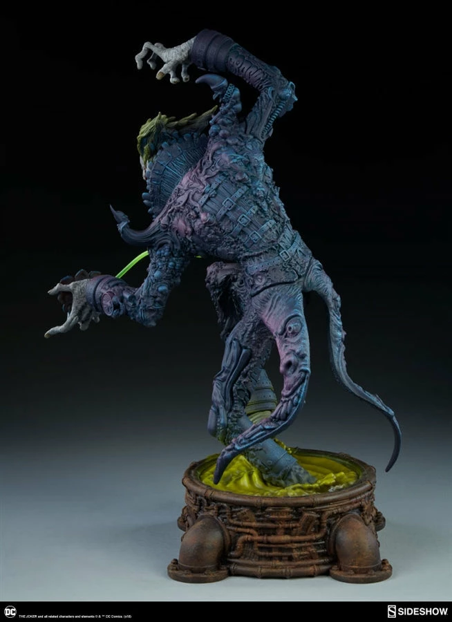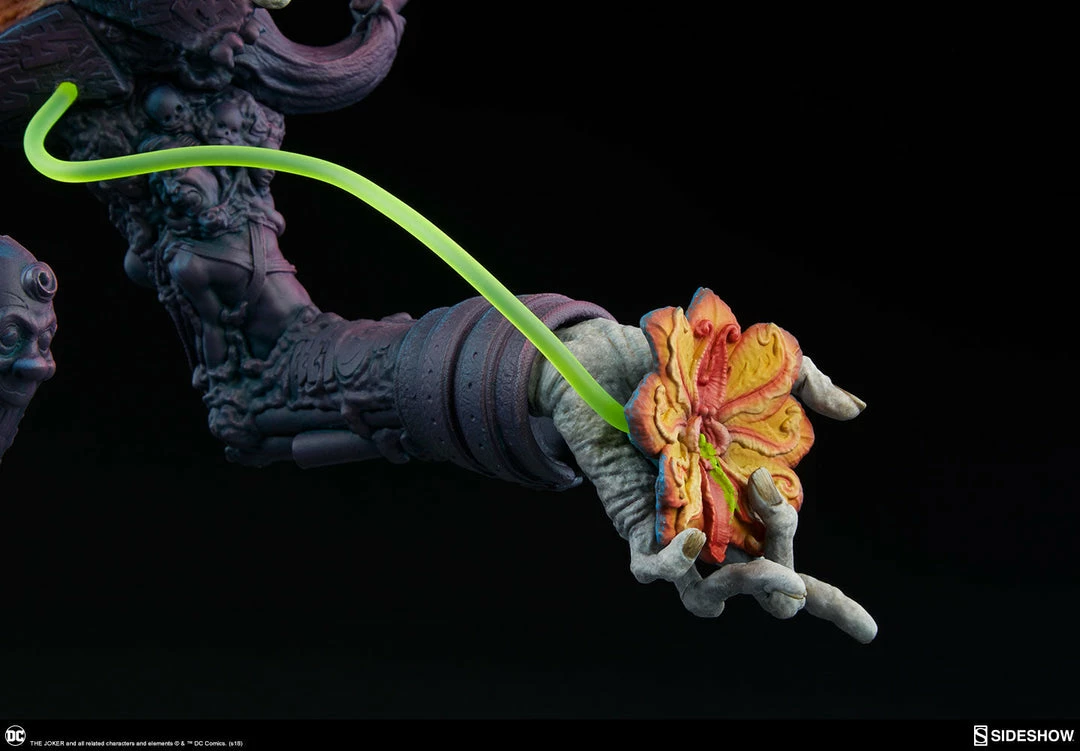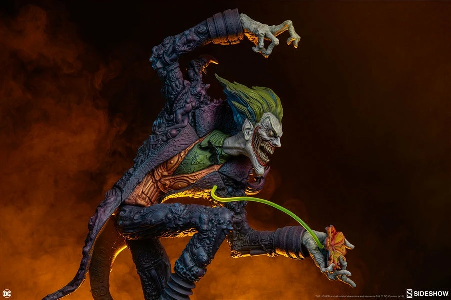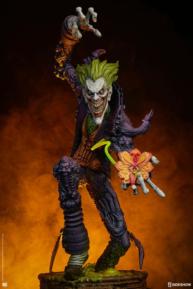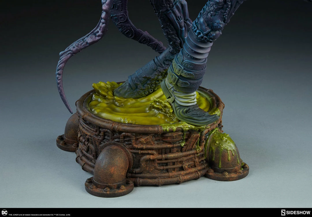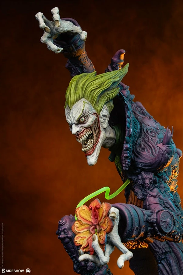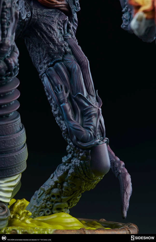 The Joker Statue measures 20 tall, emerging from a chemical vat filled with venomous green acid. Beneath copper-colored pipes, the architecture of Gotham City can be seen laying the groundwork for the rise of this nightmarish Clown Prince of Crime.