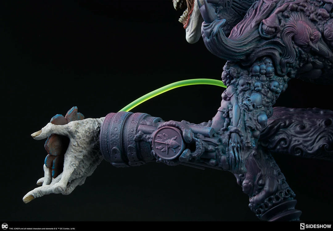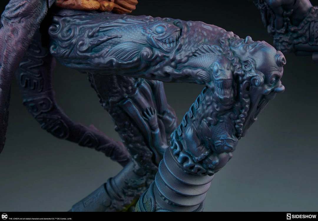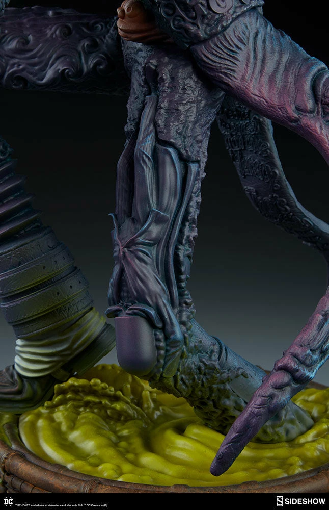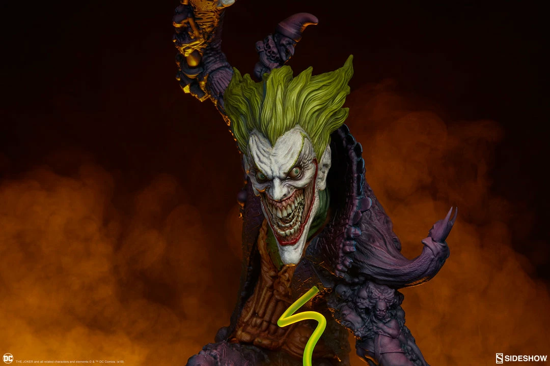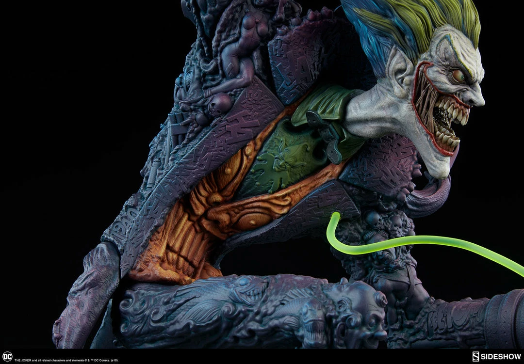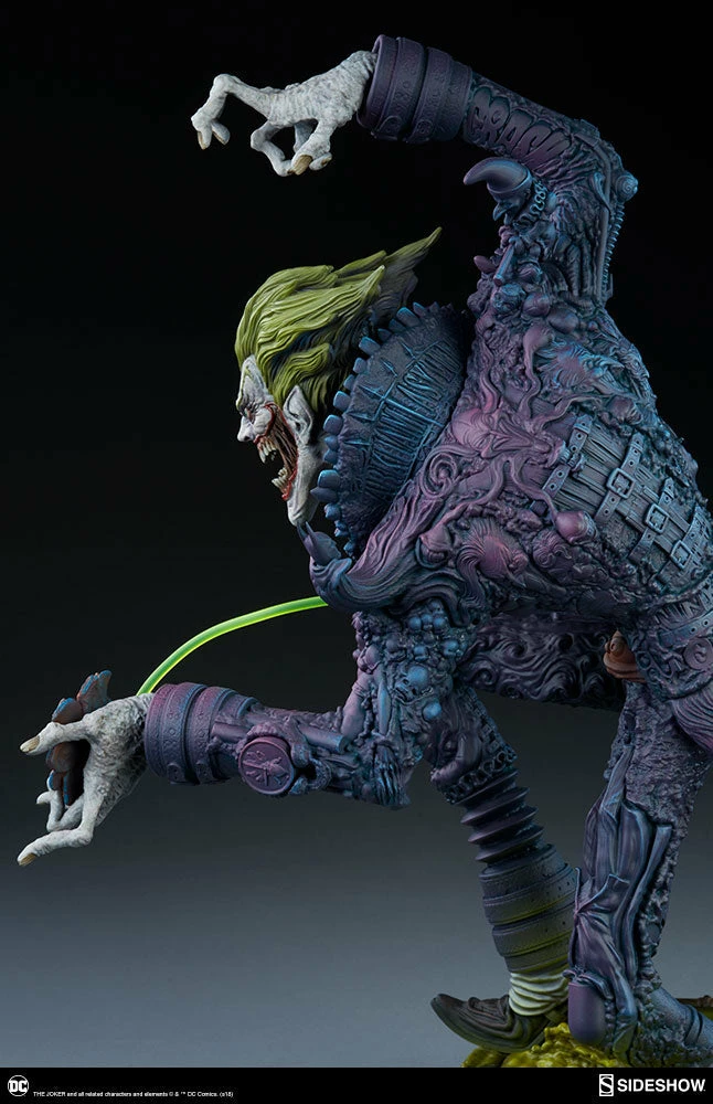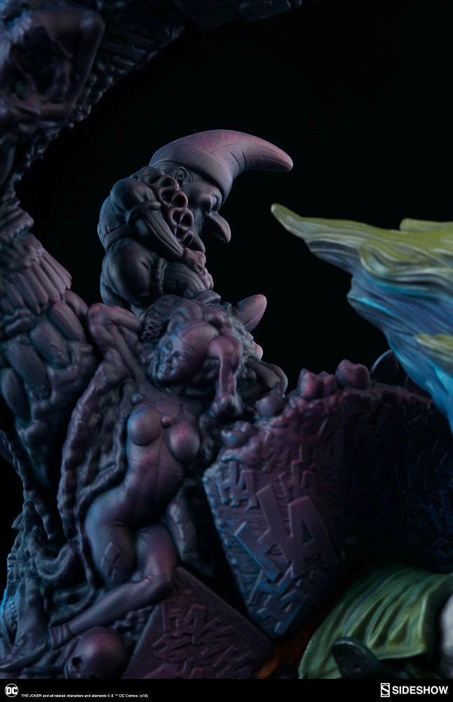 The Joker Statue measures 20 tall, emerging from a chemical vat filled with venomous green acid. Beneath copper-colored pipes, the architecture of Gotham City can be seen laying the groundwork for the rise of this nightmarish Clown Prince of Crime.