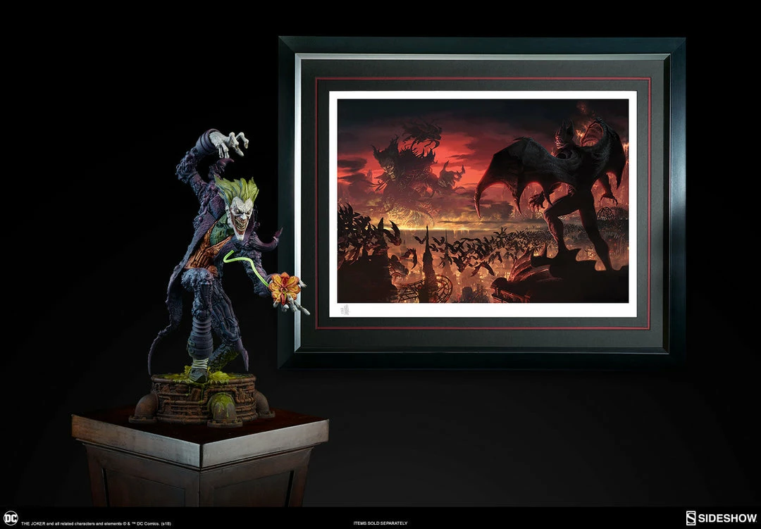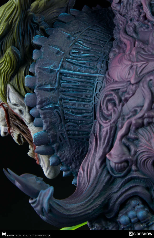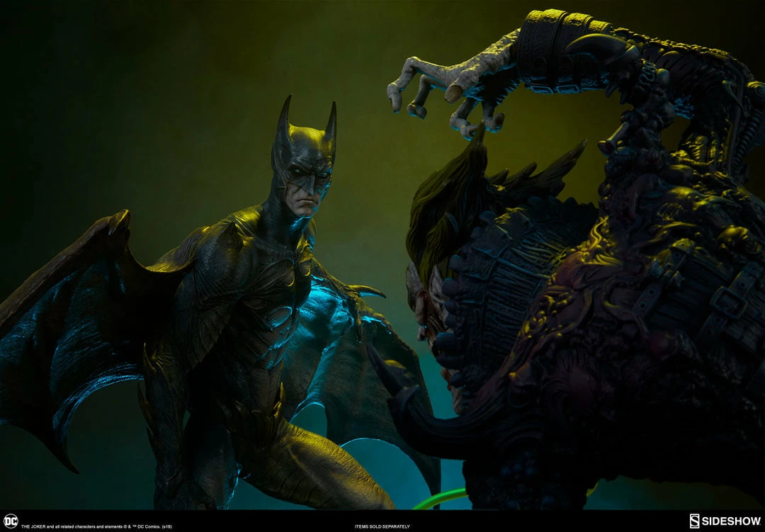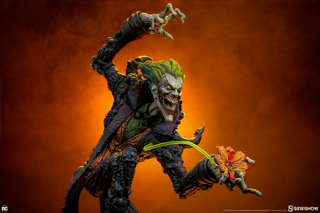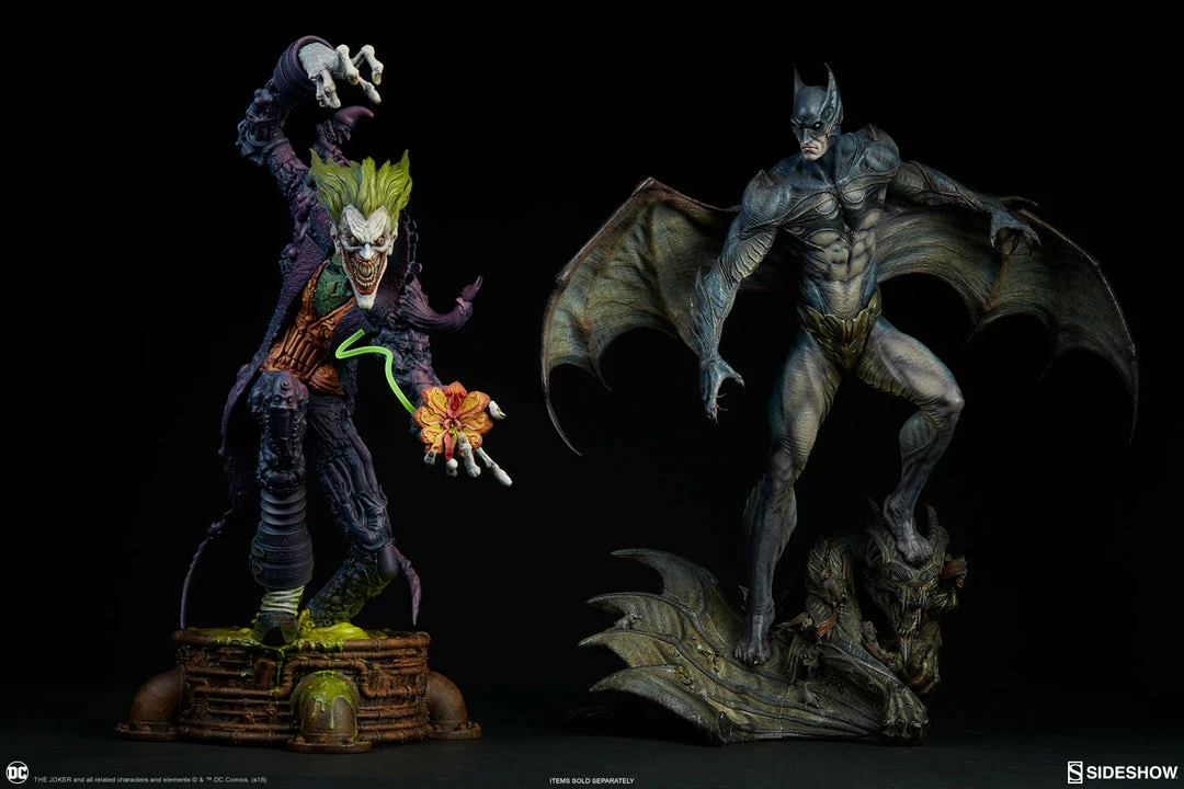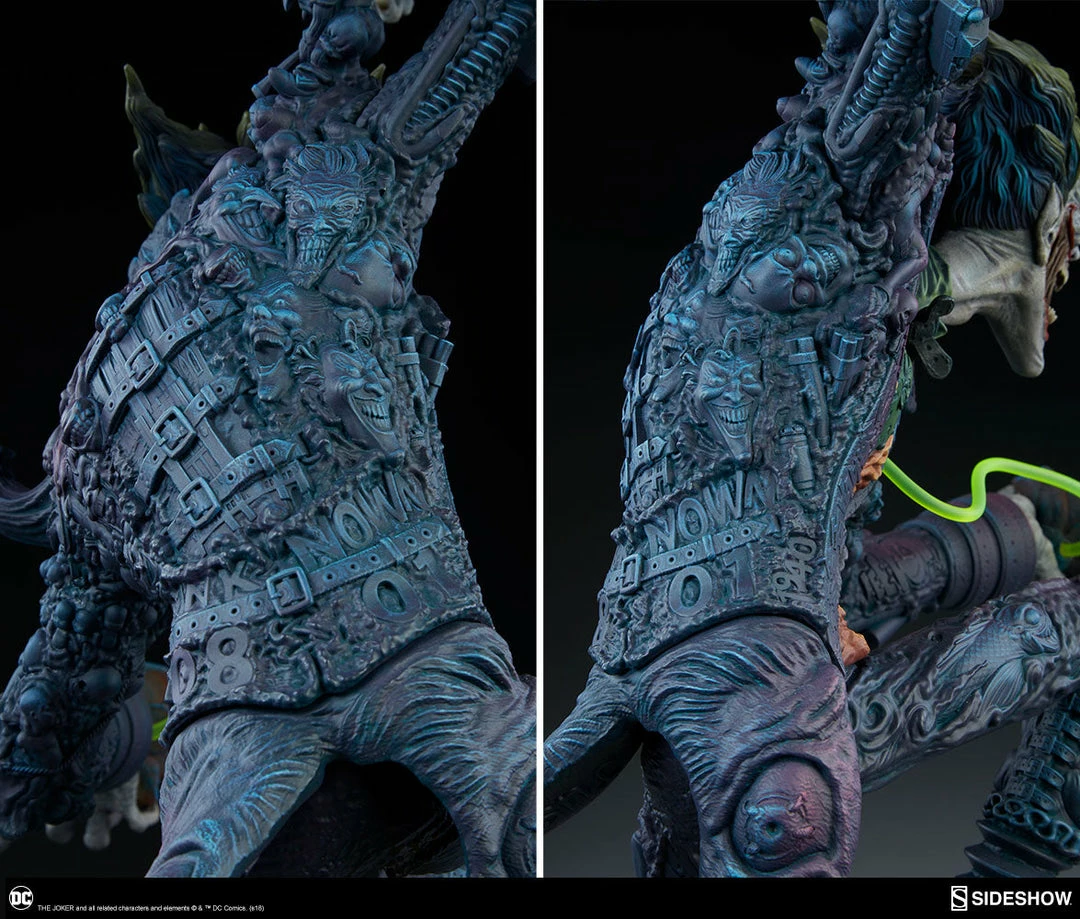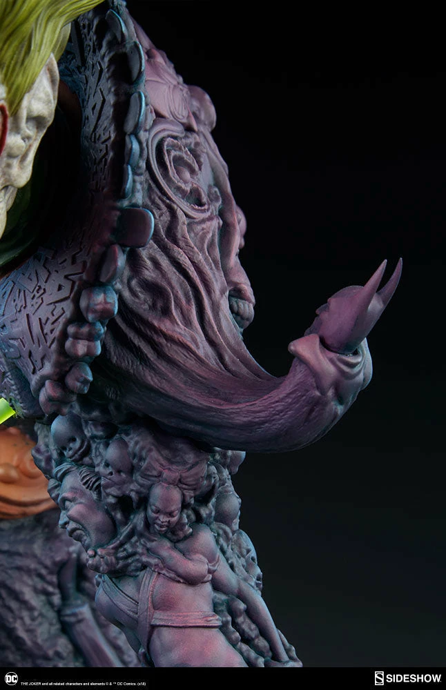 The Joker Statue measures 20 tall, emerging from a chemical vat filled with venomous green acid. Beneath copper-colored pipes, the architecture of Gotham City can be seen laying the groundwork for the rise of this nightmarish Clown Prince of Crime.