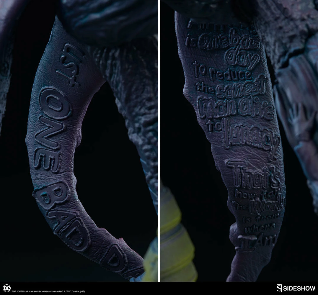 All it takes is one bad day to make The Joker Statue your most frightening nightmare yet! This intricate statue is bursting with brilliant details revealing just what makes The Joker who he is, sculpted in polystone with vinyl and PVC elements. From Ace Chemicals to the famed Arkham Asylum as his backbone, The Joker Statue will keep you captivated by the horror as you search for references to the some of the villains most infamous moments.
