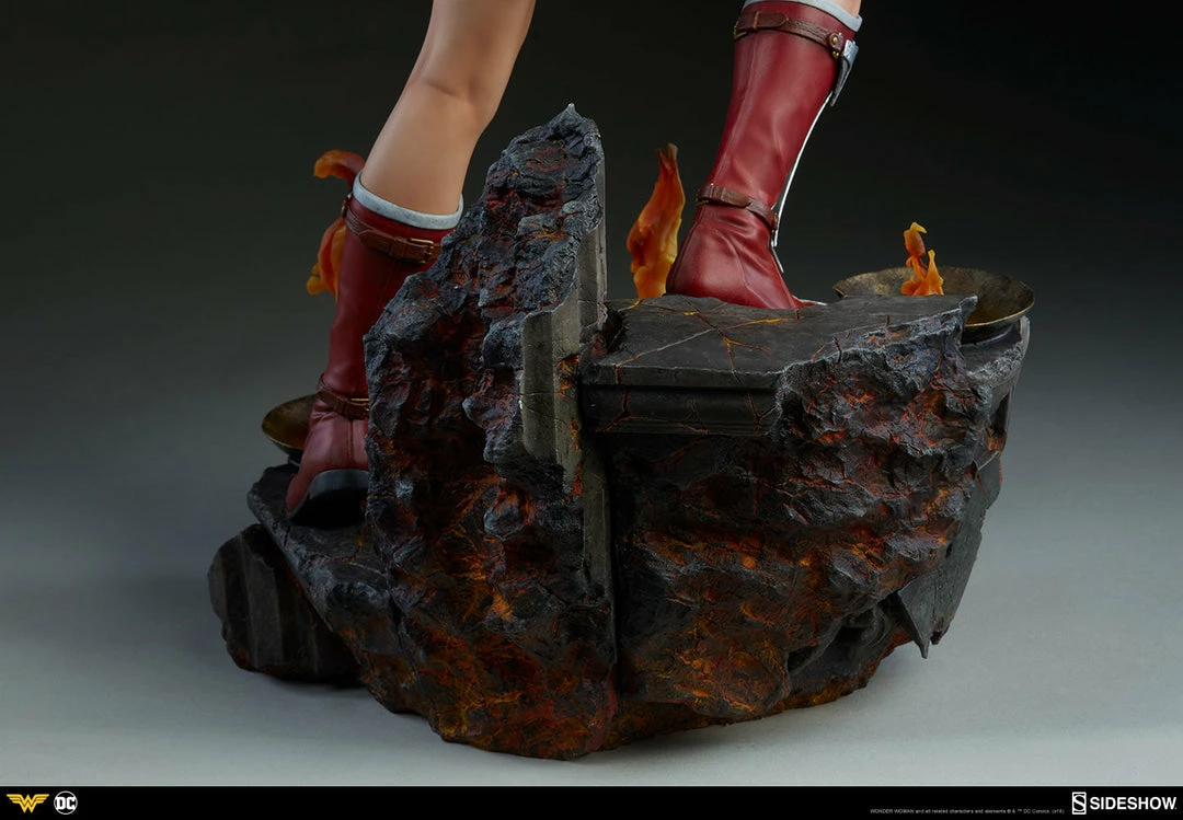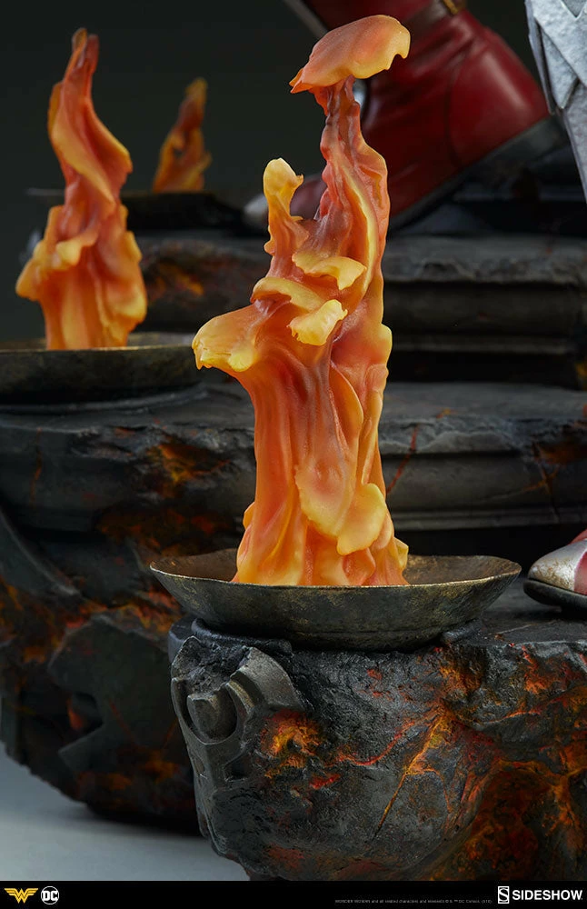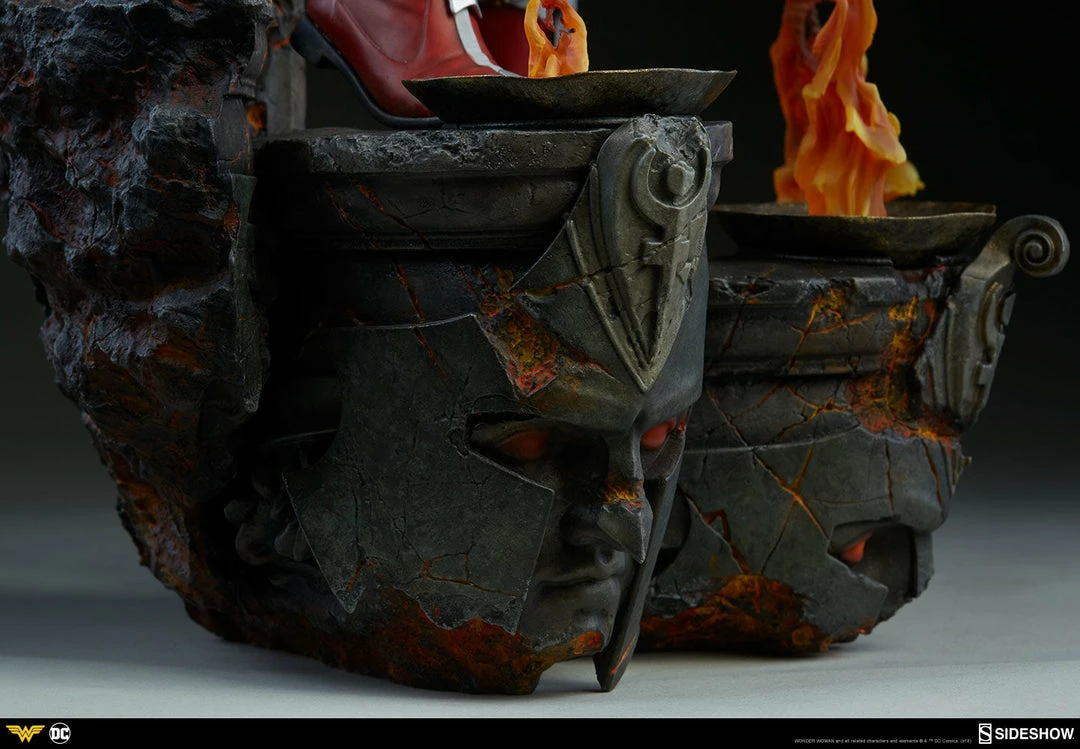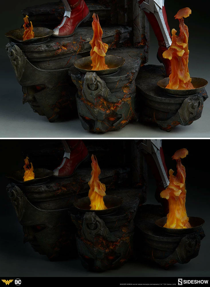 Measuring 22 tall, Wonder Woman stands on guard as she descends a blackened staircase to Hades, lined with clear resin flames that include a flickering light-up feature. The sculpted underworld staircase is detailed with molten orange hues, as well as the shadowy portraits of helmeted warriors, inspired by classical statues.