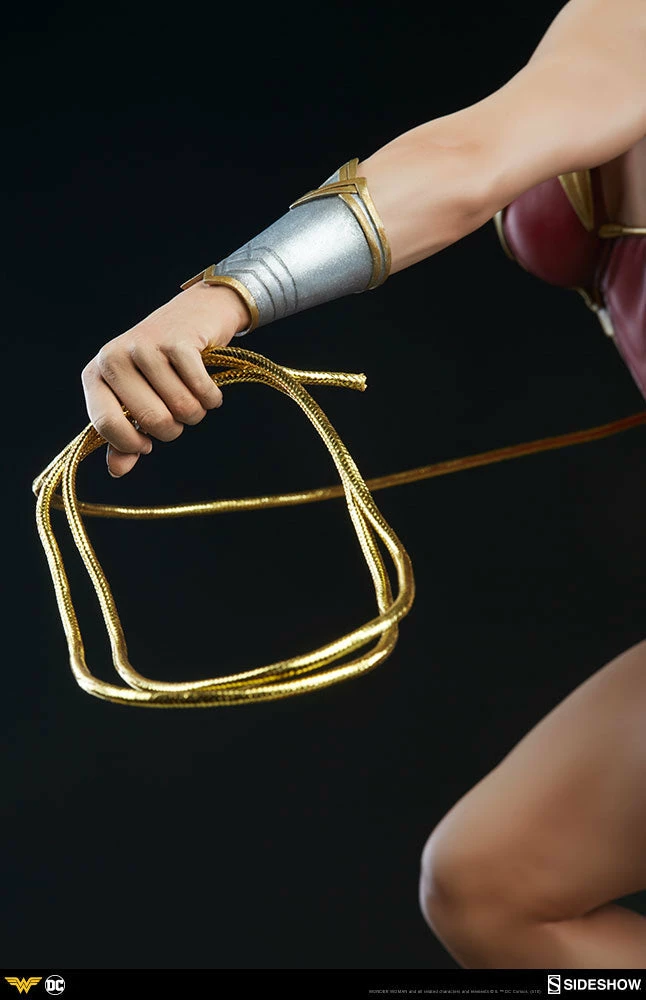 A champion of justice, Wonder Woman prepares to swing her golden Lasso of Truth at any oncoming foes, with her sword and aegis shield at her back. Both the lasso and the leather-like strap across her chest are fabric features. Wonder Woman has a beautifully detailed portrait inspired by her comic book appearance, with dynamic, windswept hair, her golden tiara and matching golden necklace, and a strong-willed expression.